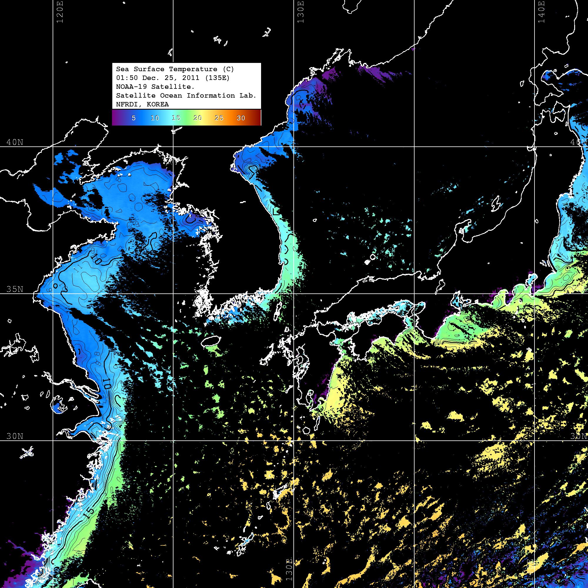 o 2011년 12월 25일 NOAA 위성영상입니다. o 영상 시간 및 수온분포는 범례를 참고하시기 바랍니다. o 검은색은 구름을 나타냅니다. o 그림을 클릭하시면 크게 보실 수 있습니다.