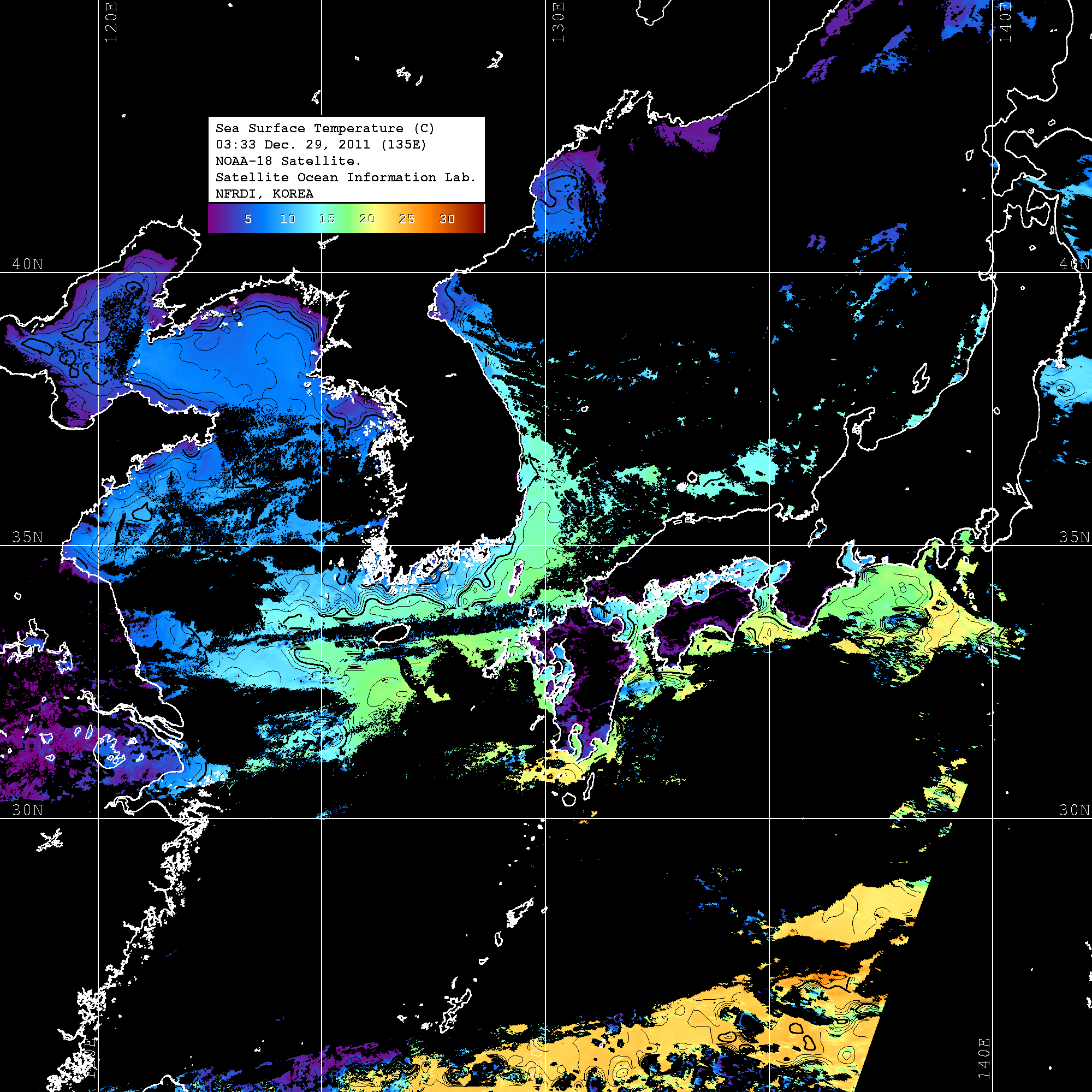 o 2011년 12월 29일 NOAA 위성영상입니다. o 영상 시간 및 수온분포는 범례를 참고하시기 바랍니다. o 검은색은 구름을 나타냅니다. o 그림을 클릭하시면 크게 보실 수 있습니다.