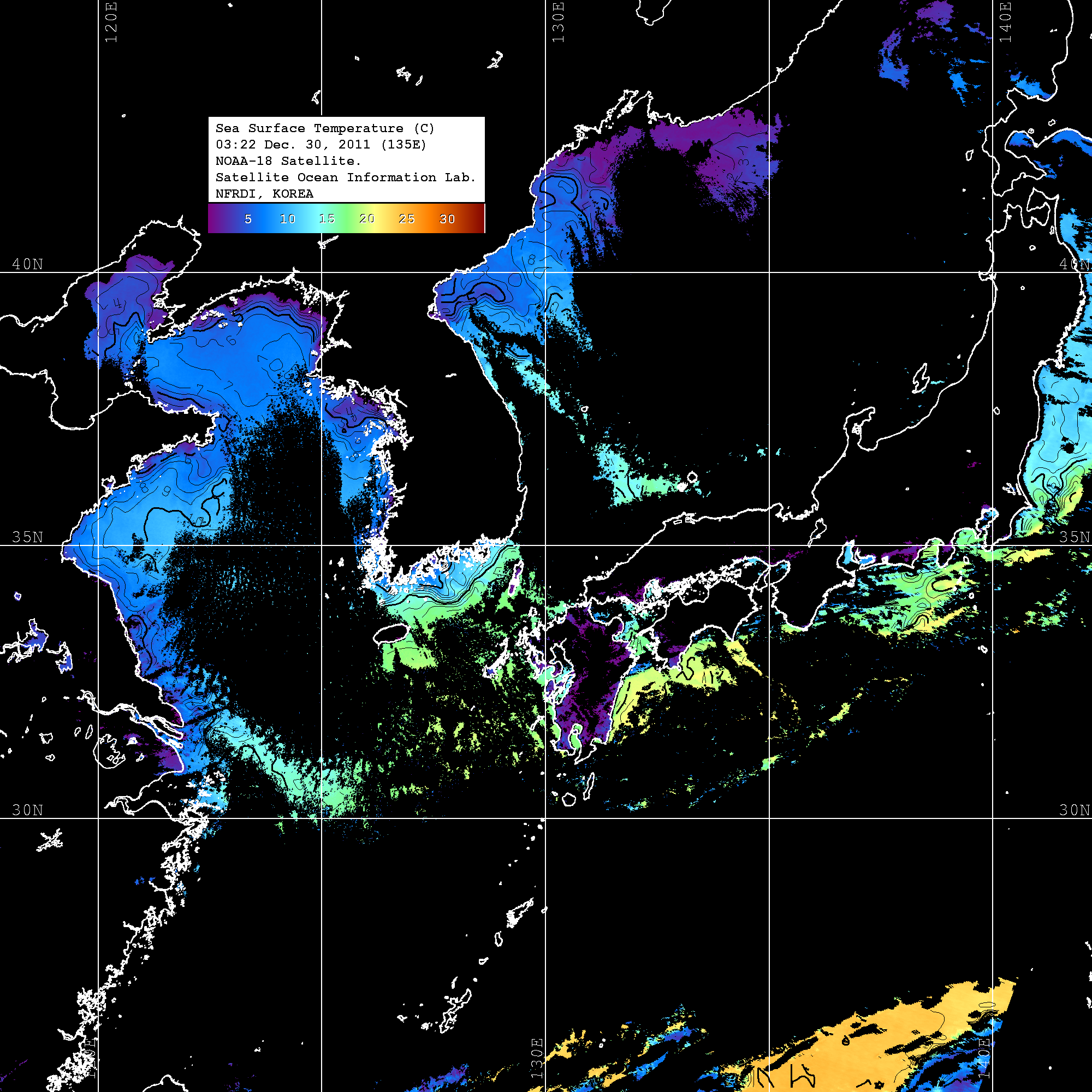 o 2011년 12월 30일 NOAA 위성영상입니다. o 영상 시간 및 수온분포는 범례를 참고하시기 바랍니다. o 검은색은 구름을 나타냅니다. o 그림을 클릭하시면 크게 보실 수 있습니다.