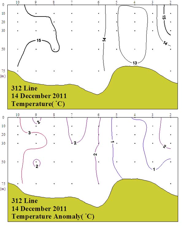 ㅇ 2011년 12월 14일 국립수산과학원 서해수산연구소에서 조사한 312선 (제주해협 서방)의 수직수온분포도 및 평년편차도입니다. ㅇ 연직혼합으로 인해 수온약층이 형성되지 않았으며, 정점 4에서 13℃로 수온이 상대적으로 낮게 나타났습니다. ㅇ 평년에 비하여 전 수층에서 1~3℃ 이상의 고온현상을 보였습니다.