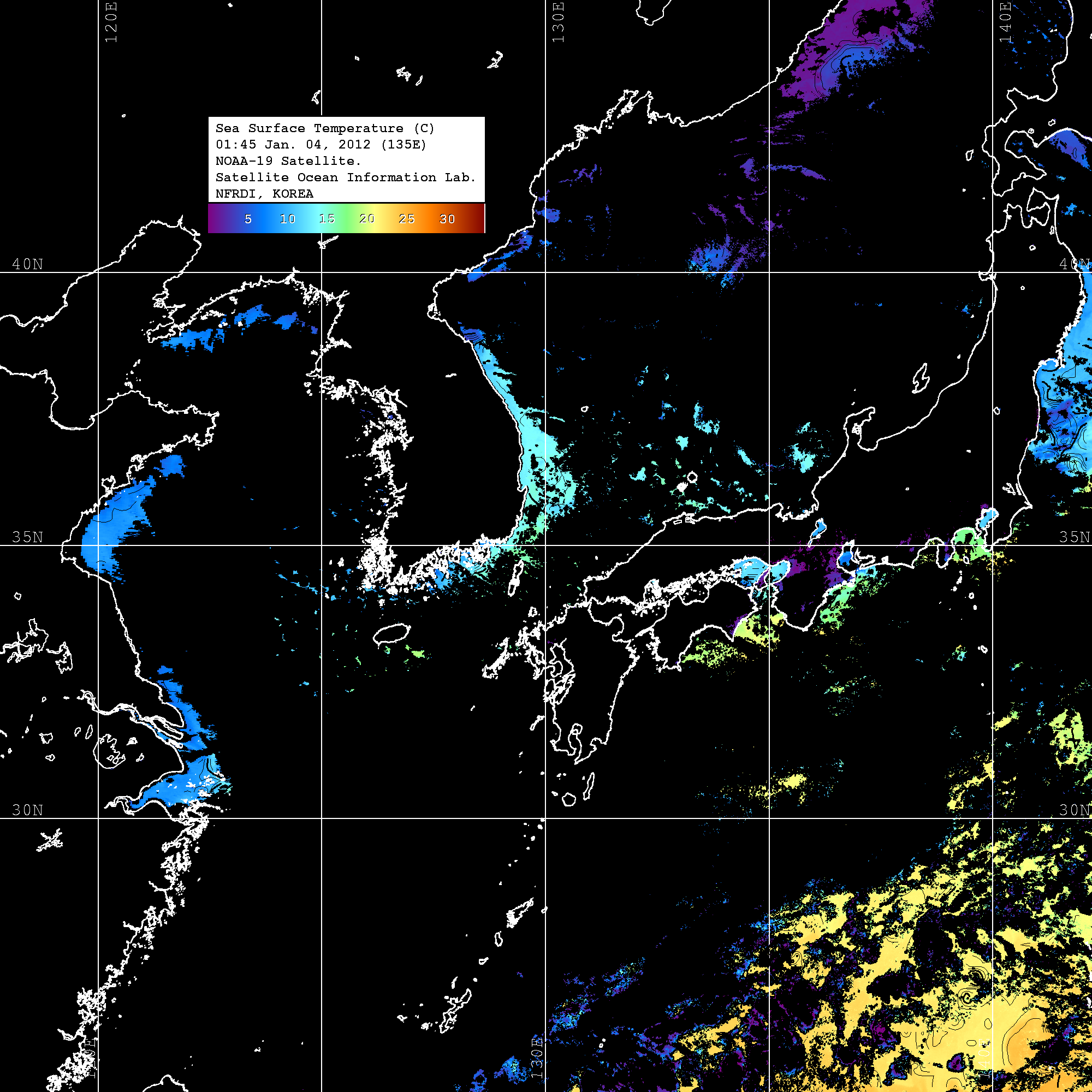 o 2012년 01월 04일 NOAA 위성영상입니다. o 영상 시간 및 수온분포는 범례를 참고하시기 바랍니다. o 검은색은 구름을 나타냅니다. o 그림을 클릭하시면 크게 보실 수 있습니다.