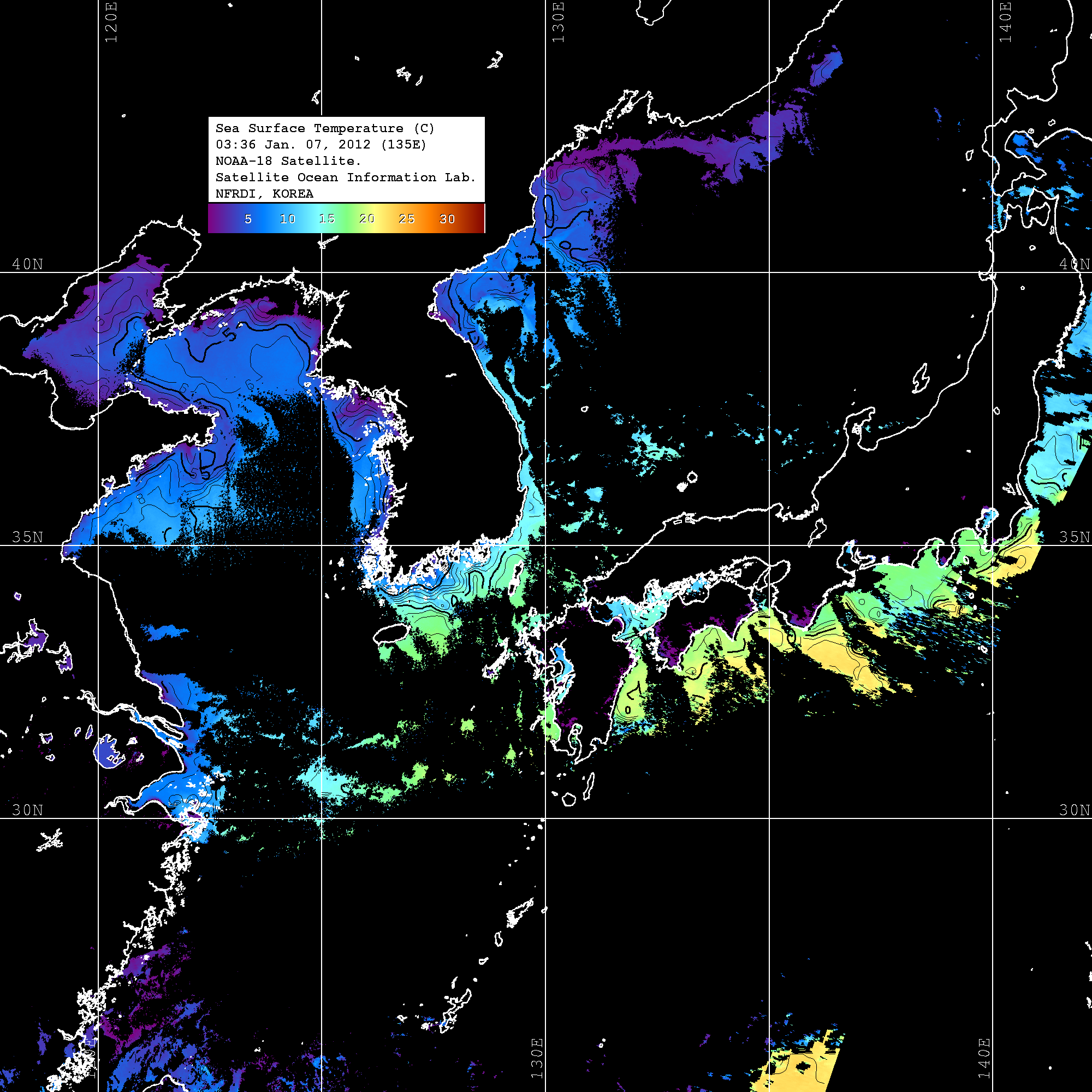 o 2012년 01월 07일 NOAA 위성영상입니다. o 영상 시간 및 수온분포는 범례를 참고하시기 바랍니다. o 검은색은 구름을 나타냅니다. o 그림을 클릭하시면 크게 보실 수 있습니다.