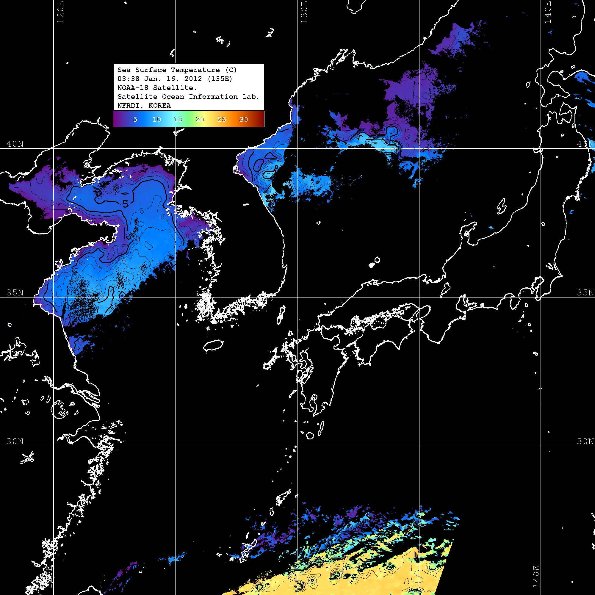 o 2012년 01월 16일 NOAA 위성영상입니다. o 영상 시간 및 수온분포는 범례를 참고하시기 바랍니다. o 검은색은 구름을 나타냅니다. o 그림을 클릭하시면 크게 보실 수 있습니다.