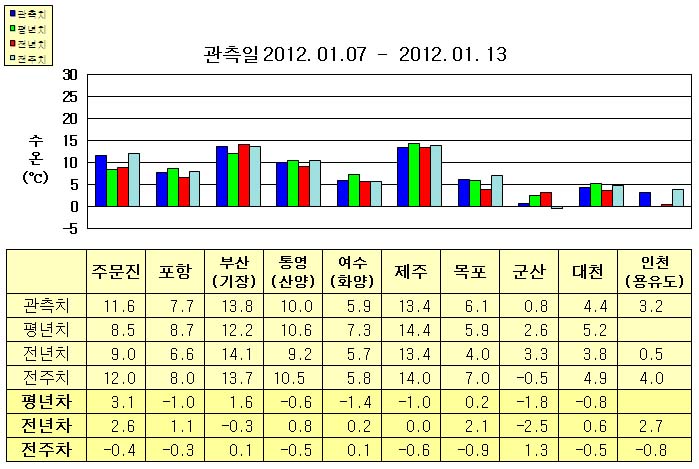 o 금주(2012.01.07~2012.01.13)의 한반도 연안 표면수온은 동해 연안역에서 섭씨 7.5~14.0도, 남해 연안역 5.5~13.5도, 서해 연안역에서 0.5~6.5도로 나타납니다. o 평년에 비해 포항 1도 낮음을 제외한 동해 연안역은 1.5~3.5도 높게, 남해 연안역은 0.5~1.5도 낮게, 목포 비슷함을 제외한 서해 연안역은 0.5~2.0도 낮게 나타납니다. o 전년에 비해 부산(기장) 비슷함을 제외한 동해 연안역은 1~3도 높게, 통영(산양) 0.8도 높음을 제외한 남해 연안역은 비슷하게, 군산 2.5도 낮음을 제외한 서해 연안역은 0.5~3.0도 높게 나타납니다.