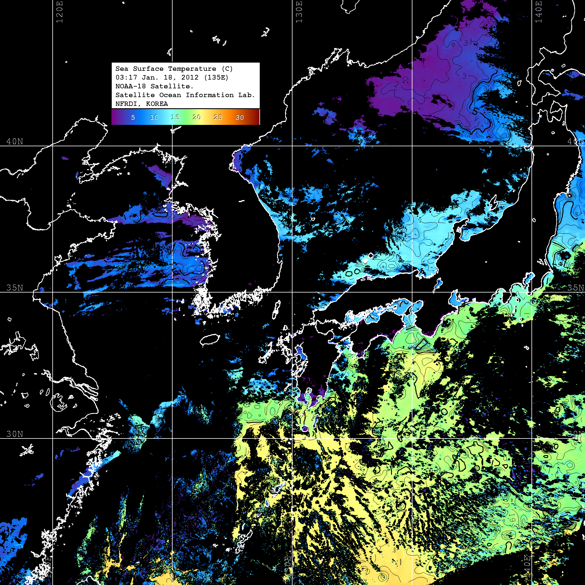 o 2012년 01월 18일 NOAA 위성영상입니다. o 영상 시간 및 수온분포는 범례를 참고하시기 바랍니다. o 검은색은 구름을 나타냅니다. o 그림을 클릭하시면 크게 보실 수 있습니다.