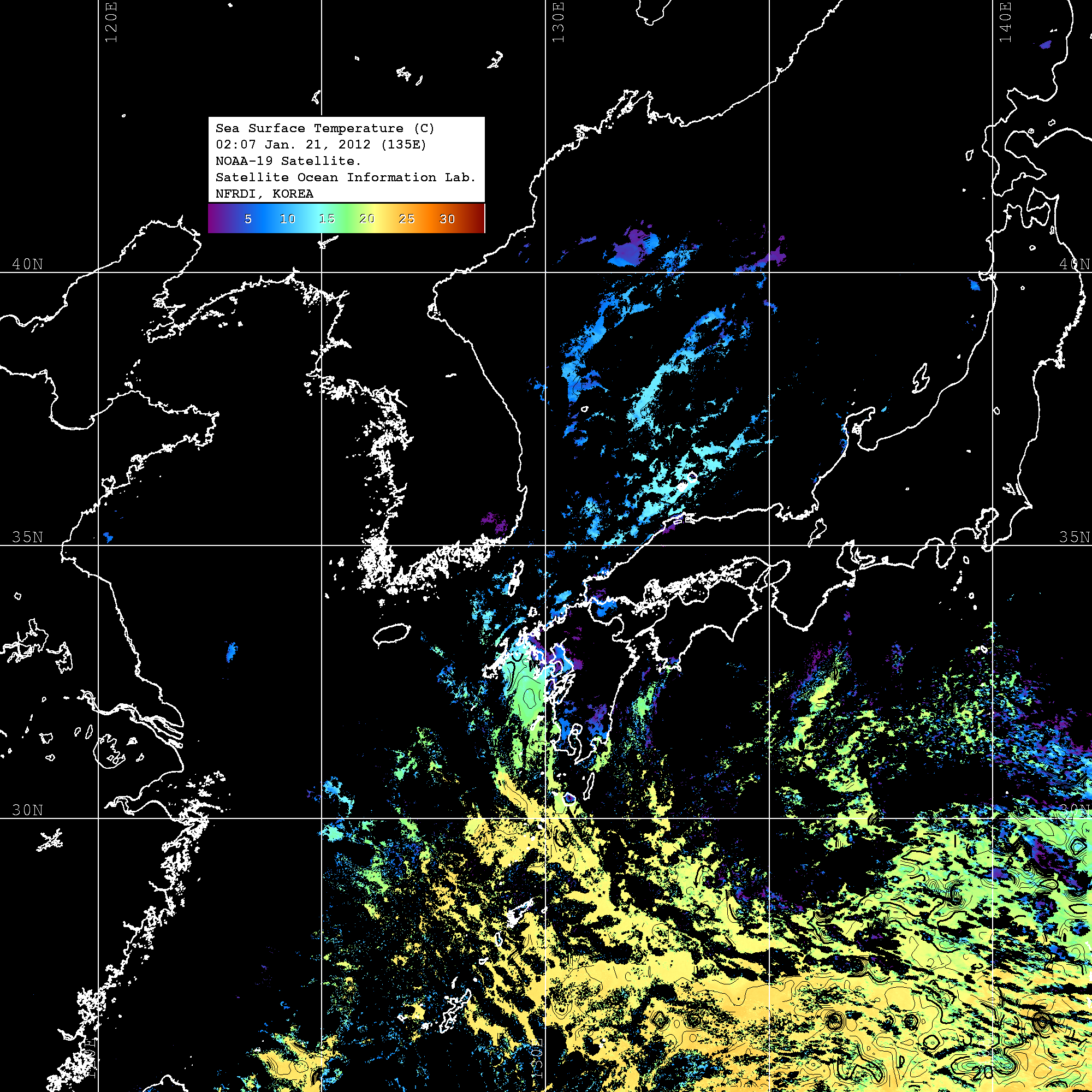 o 2012년 01월 21일 NOAA 위성영상입니다. o 영상 시간 및 수온분포는 범례를 참고하시기 바랍니다. o 검은색은 구름을 나타냅니다. o 그림을 클릭하시면 크게 보실 수 있습니다.