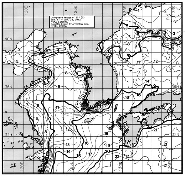 o 금주(2012.01.17~2012.01.23)의 한국근해 표면수온은 대화퇴 근해 10~12도, 울릉도 근해 12~13도, 대마도 근해 16~17도, 제주도 근해 15~17도, 이어도 근해 12~13도, 가거초 근해 11~12도, 어청도 근해 8~9도로 나타납니다. o「평년에 비해」대화퇴 근해 2.6도 높게, 울릉도 근해 비슷하게, 대마도 근해 비슷하게, 제주도 근해 0.5도 낮게, 이어도 근해 0.5도 낮게, 가거초 근해 비슷하게, 어청도 근해는 0.8도 높게 나타납니다. o「전년에 비해」대화퇴 근해 4.5도 높게, 울릉도 근해 비슷하게, 대마도 근해 0.5도 높게, 제주도 근해 1도 높게, 이어도 근해 3도 높게, 가거초 근해 1.5도 높게, 어청도 근해는 4도 높게 나타납니다. o 수온 전선대는 우리나라 제주해협에서 대한해협까지 15도를 중심으로 형성됩니다. o 서해 연안역에서 평년대비 수온이 낮게 나타난 것으로 예상되오니 연안 양식장에서는 주의를 요합니다.