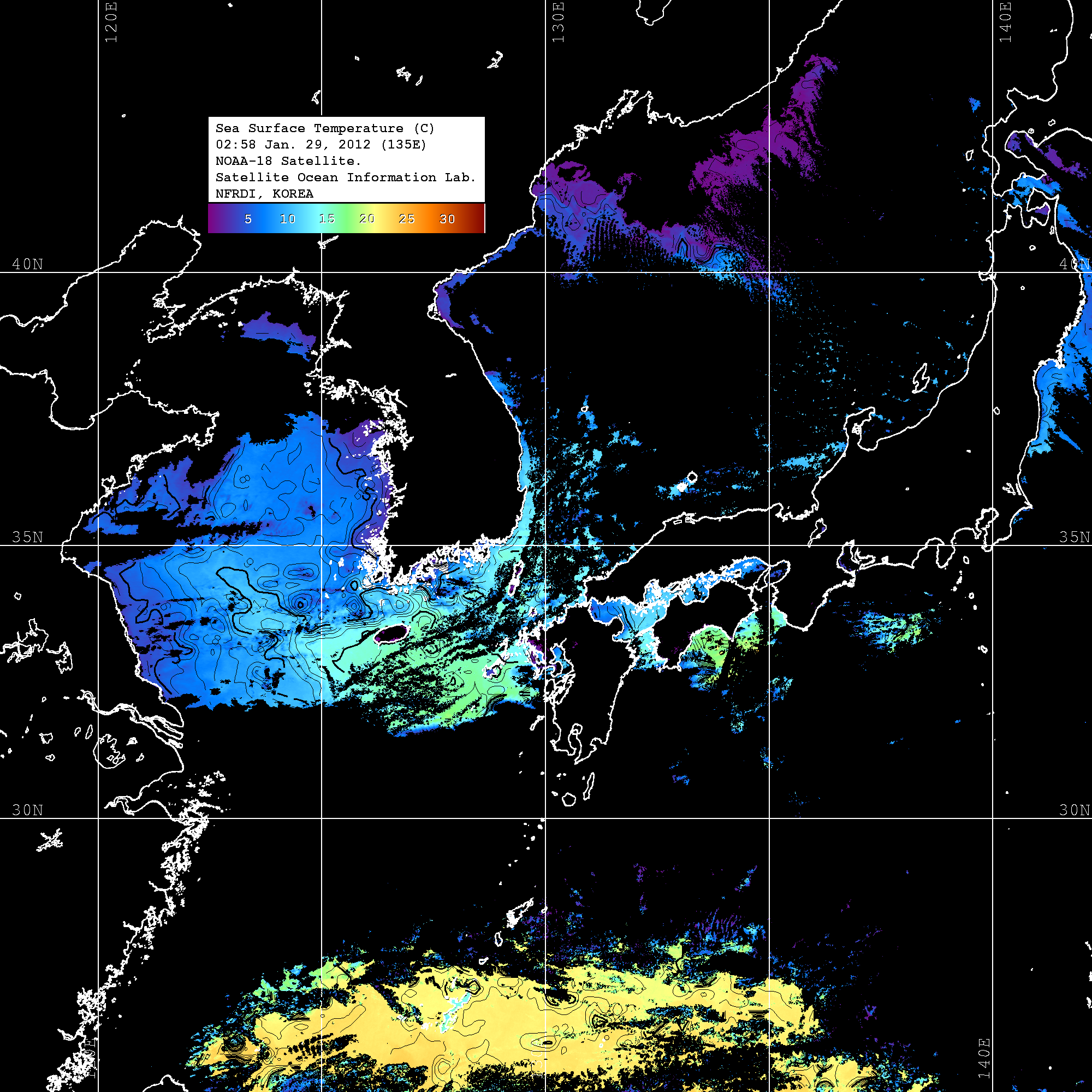 o 2012년 01월 29일 NOAA 위성영상입니다. o 영상 시간 및 수온분포는 범례를 참고하시기 바랍니다. o 검은색은 구름을 나타냅니다. o 그림을 클릭하시면 크게 보실 수 있습니다.