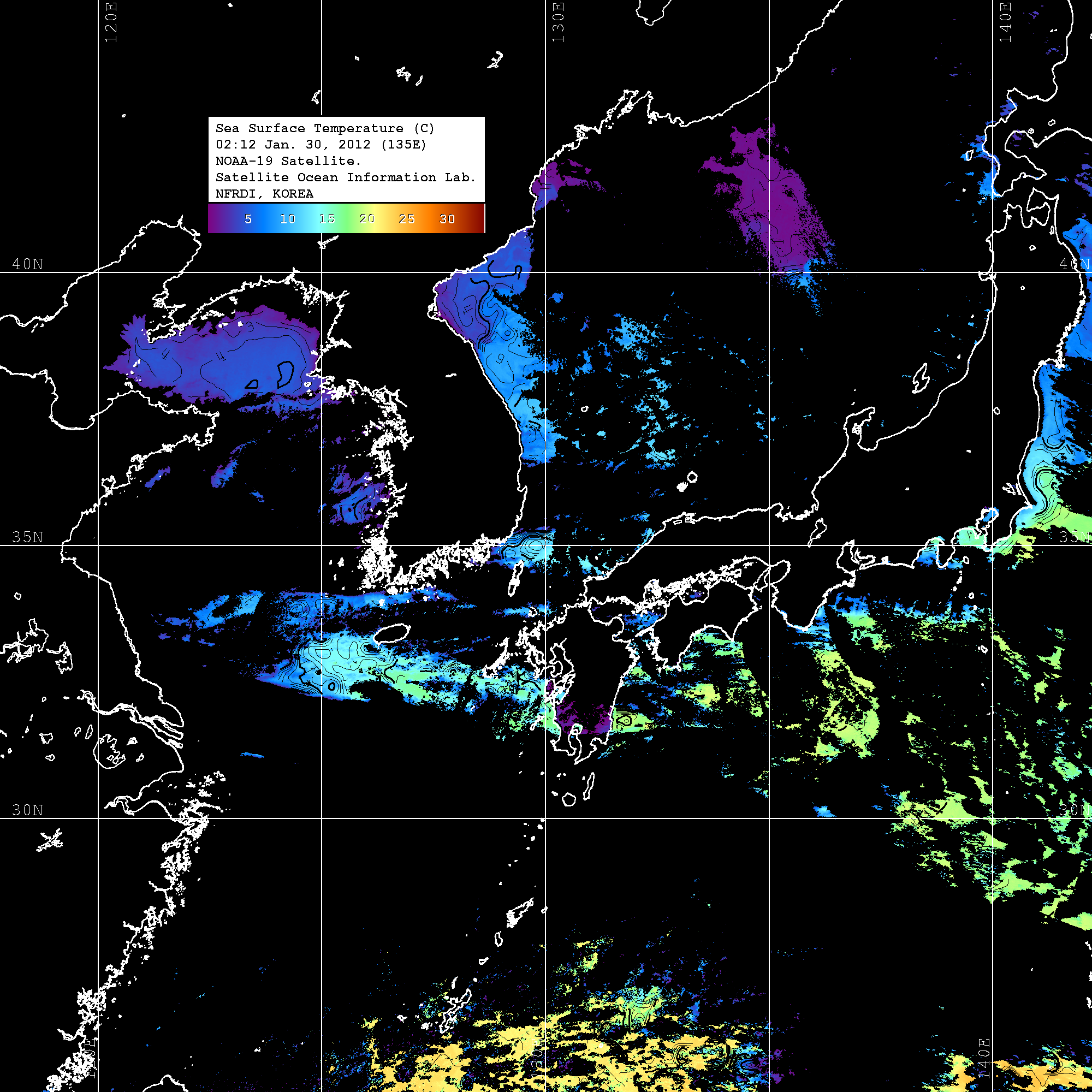 o 2012년 01월 30일 NOAA 위성영상입니다. o 영상 시간 및 수온분포는 범례를 참고하시기 바랍니다. o 검은색은 구름을 나타냅니다. o 그림을 클릭하시면 크게 보실 수 있습니다.