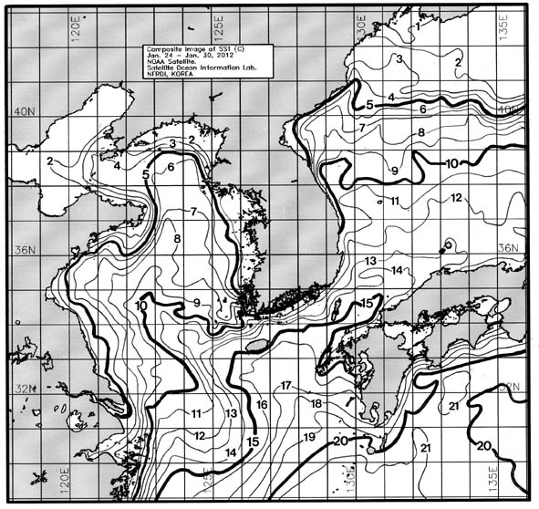 o 금주(2012.01.24~2012.01.30)의 한국근해 표면수온은 대화퇴 근해 8~10도, 울릉도 근해 11~12도, 대마도 근해 14~15도, 제주도 근해 14~15도, 이어도 근해 11~12도, 가거초 근해 8~10도, 어청도 근해 4~5도로 나타납니다. o「평년에 비해」대화퇴 근해 0.4도 높게, 울릉도 근해 비슷하게, 대마도 근해 0.7도 낮게, 제주도 근해 0.4도 낮게, 이어도 근해 비슷하게, 가거초 근해 1.4도 낮게, 어청도 근해는 1.7도 낮게 나타납니다. o「전년에 비해」대화퇴 근해 2.5도 높게, 울릉도 근해 비슷하게, 대마도 근해 1도 낮게, 제주도 근해 1도 낮게, 이어도 근해 1.5도 높게, 가거초 근해 4도 낮게, 어청도 근해는 1도 낮게 나타납니다. o 수온 전선대는 우리나라 제주해협에서 대한해협까지 14도를 중심으로 형성됩니다.