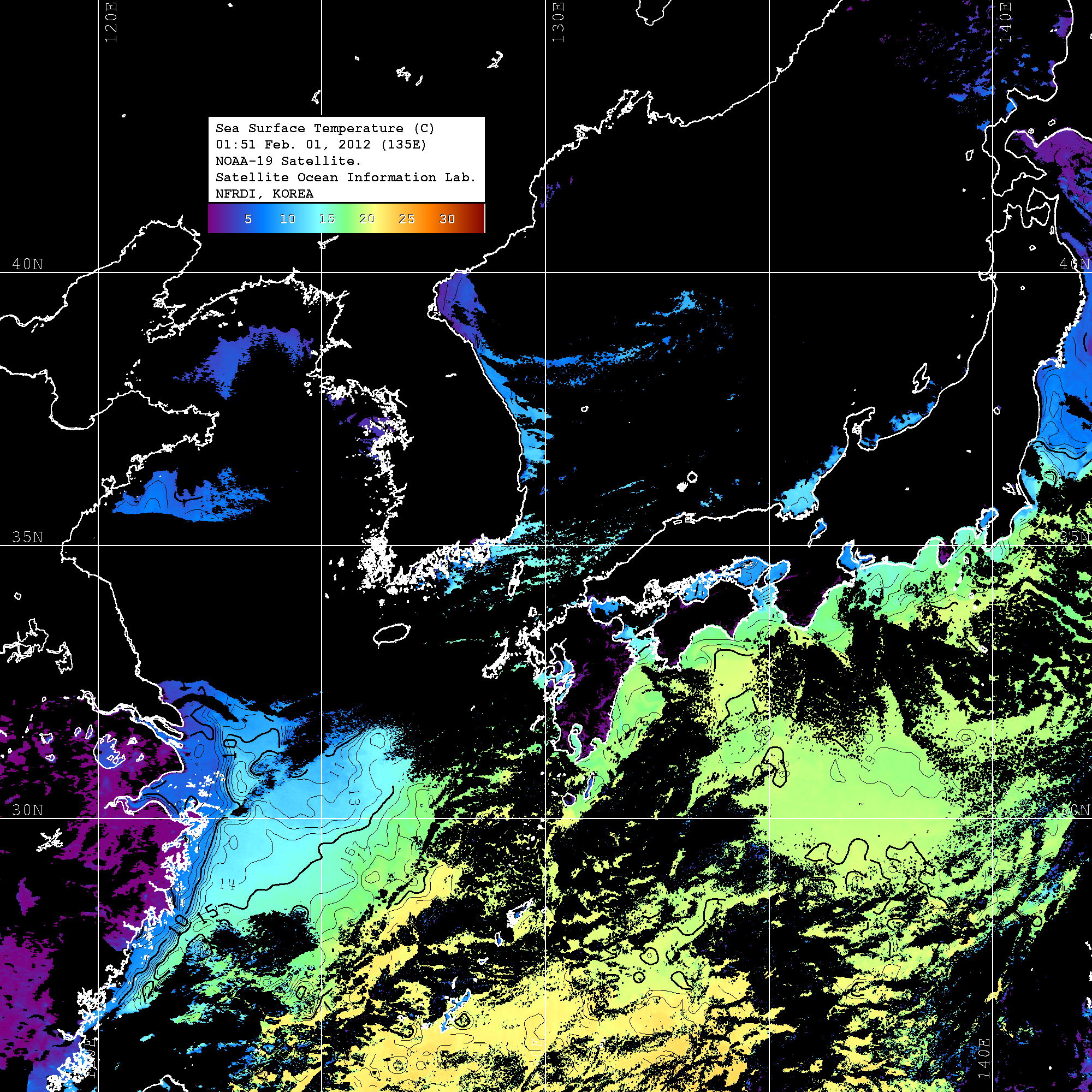 o 2012년 20월 01일 NOAA 위성영상입니다. o 영상 시간 및 수온분포는 범례를 참고하시기 바랍니다. o 검은색은 구름을 나타냅니다. o 그림을 클릭하시면 크게 보실 수 있습니다.