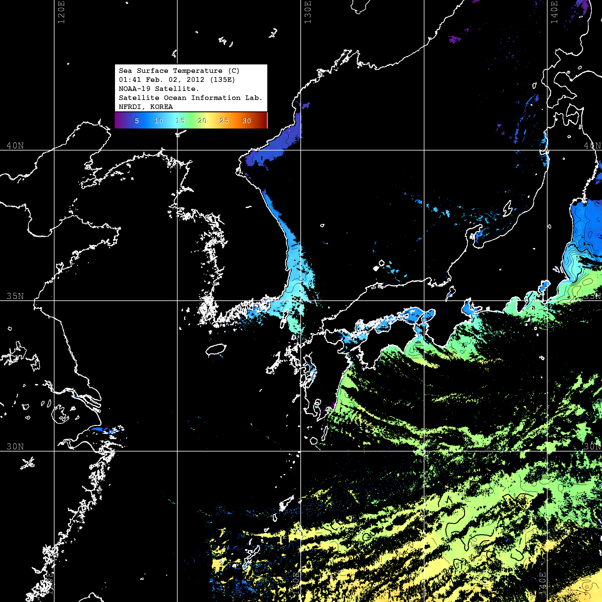 o 2012년 02월 02일 NOAA 위성영상입니다. o 영상 시간 및 수온분포는 범례를 참고하시기 바랍니다. o 검은색은 구름을 나타냅니다. o 그림을 클릭하시면 크게 보실 수 있습니다.