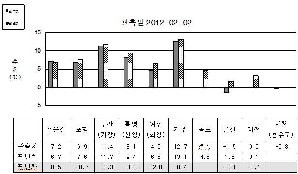 o 최근(2012.01.29~2012.02.02)위성관측의 한국근해 표면수온은 울릉도 근해 11~12도, 대마도 근해 14~15도, 제주도 근해 14~15도, 가거초 근해 9~10도, 어청도 근해 4~6도로 나타납니다. o 그러나 특히 서해연안역 수온은 섭씨 2도 이하의 매우 낮은 수온을 보입니다.