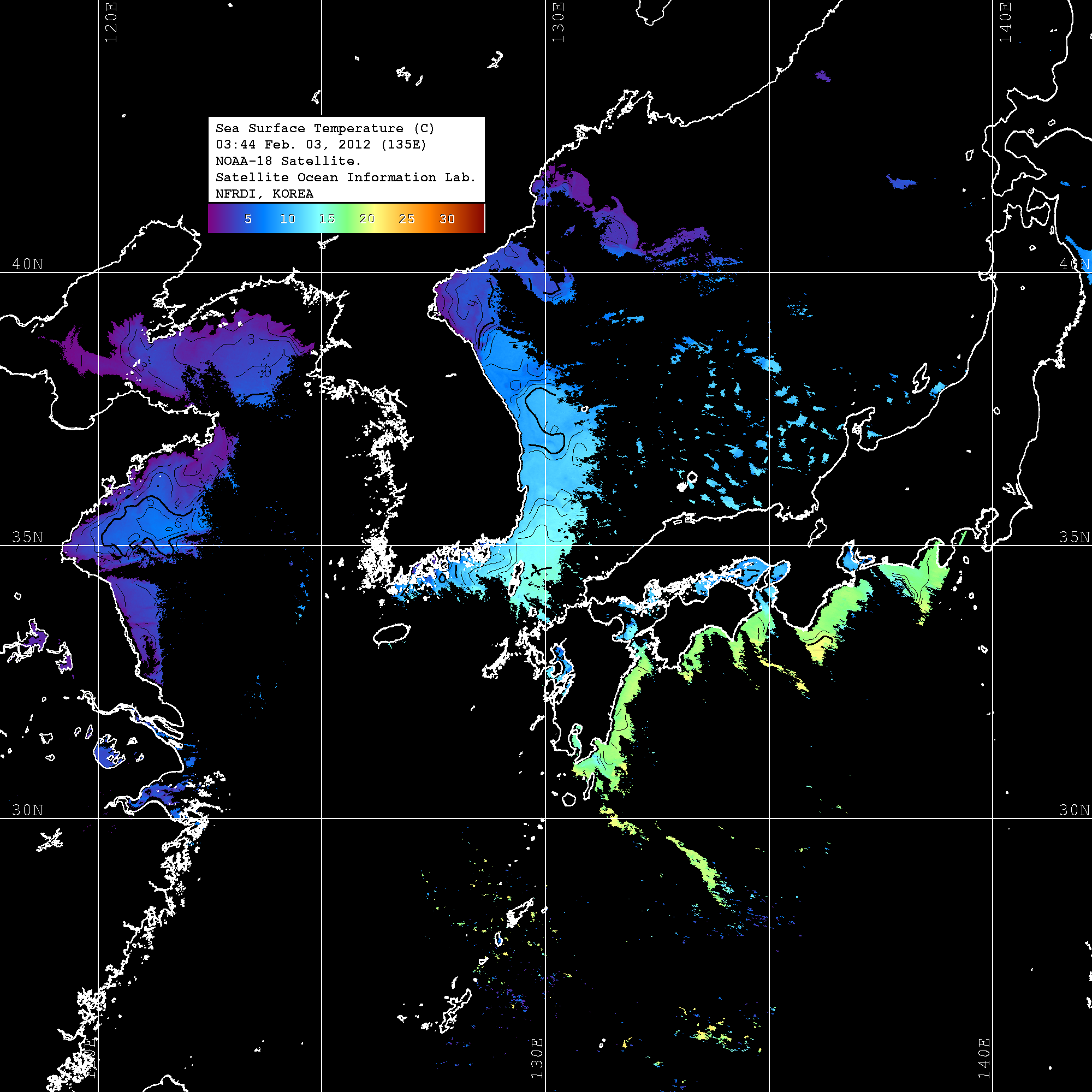 o 2012년 02월 03일 NOAA 위성영상입니다. o 영상 시간 및 수온분포는 범례를 참고하시기 바랍니다. o 검은색은 구름을 나타냅니다. o 그림을 클릭하시면 크게 보실 수 있습니다.