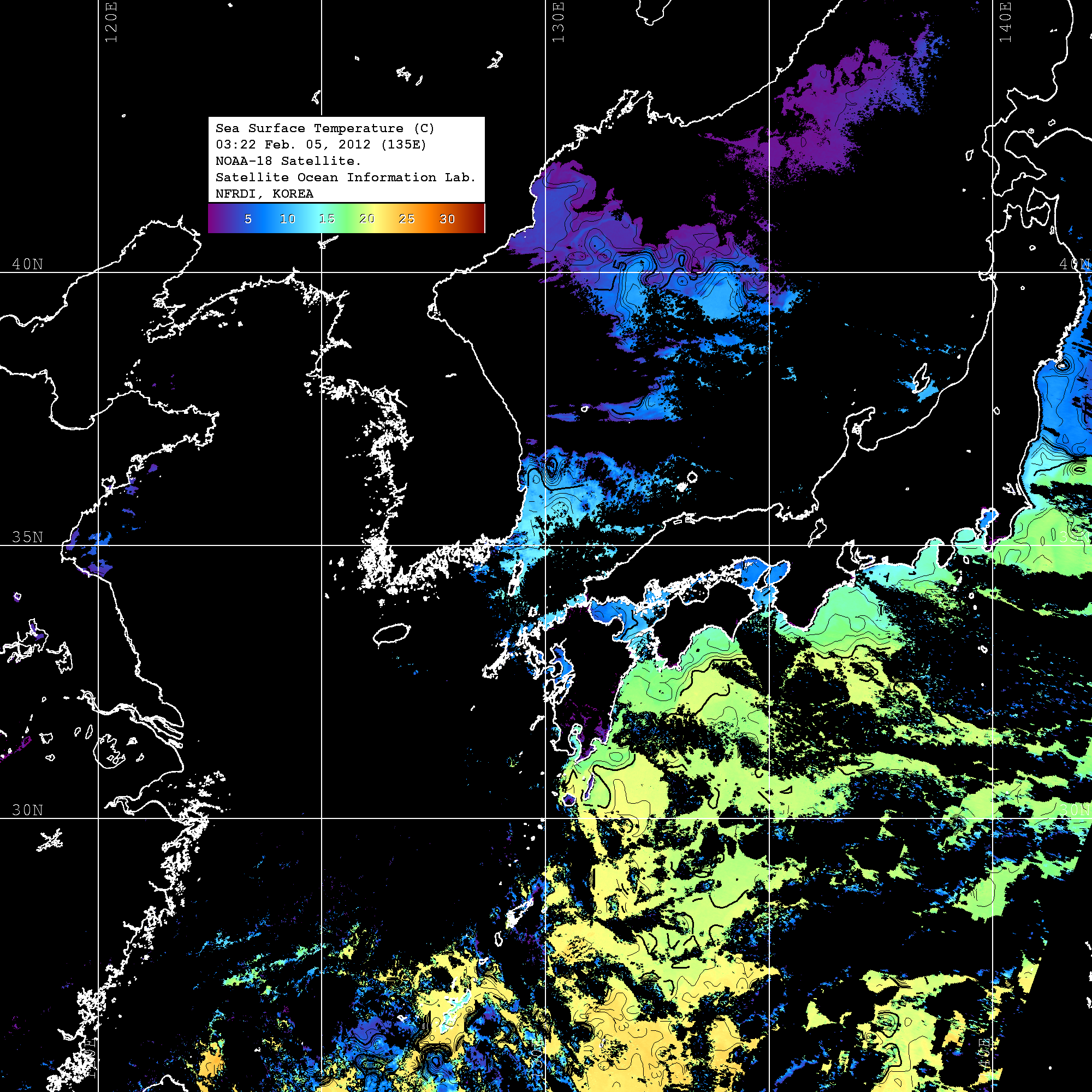 o 2012년 02월 05일 NOAA 위성영상입니다. o 영상 시간 및 수온분포는 범례를 참고하시기 바랍니다. o 검은색은 구름을 나타냅니다. o 그림을 클릭하시면 크게 보실 수 있습니다.