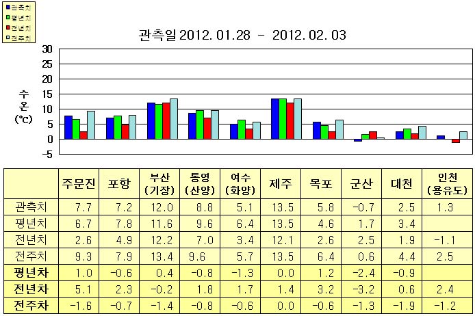 o 금주(2012.01.28~2012.02.03)의 한반도 연안 표면수온은 동해 연안역에서 섭씨 7~12도, 남해 연안역 5.0~13.5도, 서해 연안역에서 -1~6도로 나타납니다. o 평년에 비해 포항 0.6도 낮음을 제외한 동해 연안역은 0.5~1.0도 높게, 제주 비슷함을 제외한 남해 연안역은 0.5~1.5도 낮게, 목포 1.2도 높음을 제외한 서해 연안역은 0.5~2.5도 낮게 나타납니다. o 전년에 비해 부산(기장) 비슷함을 제외한 동해 연안역은 2.0~5.5도 높게, 남해 연안역은 1~2도 높게, 군산 3.2도 낮음을 제외한 서해 연안역은 0.5~3.5도 높게 나타납니다. o 전국 연안 양식장에서는 저수온현상이 예측되므로 피해가 발생하지 않도록 각별한 주의와 관리를 부탁드립니다.