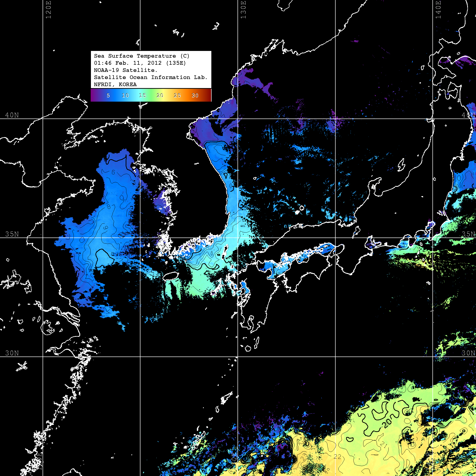 o 2012년 02월 11일 NOAA 위성영상입니다. o 영상 시간 및 수온분포는 범례를 참고하시기 바랍니다. o 검은색은 구름을 나타냅니다. o 그림을 클릭하시면 크게 보실 수 있습니다.