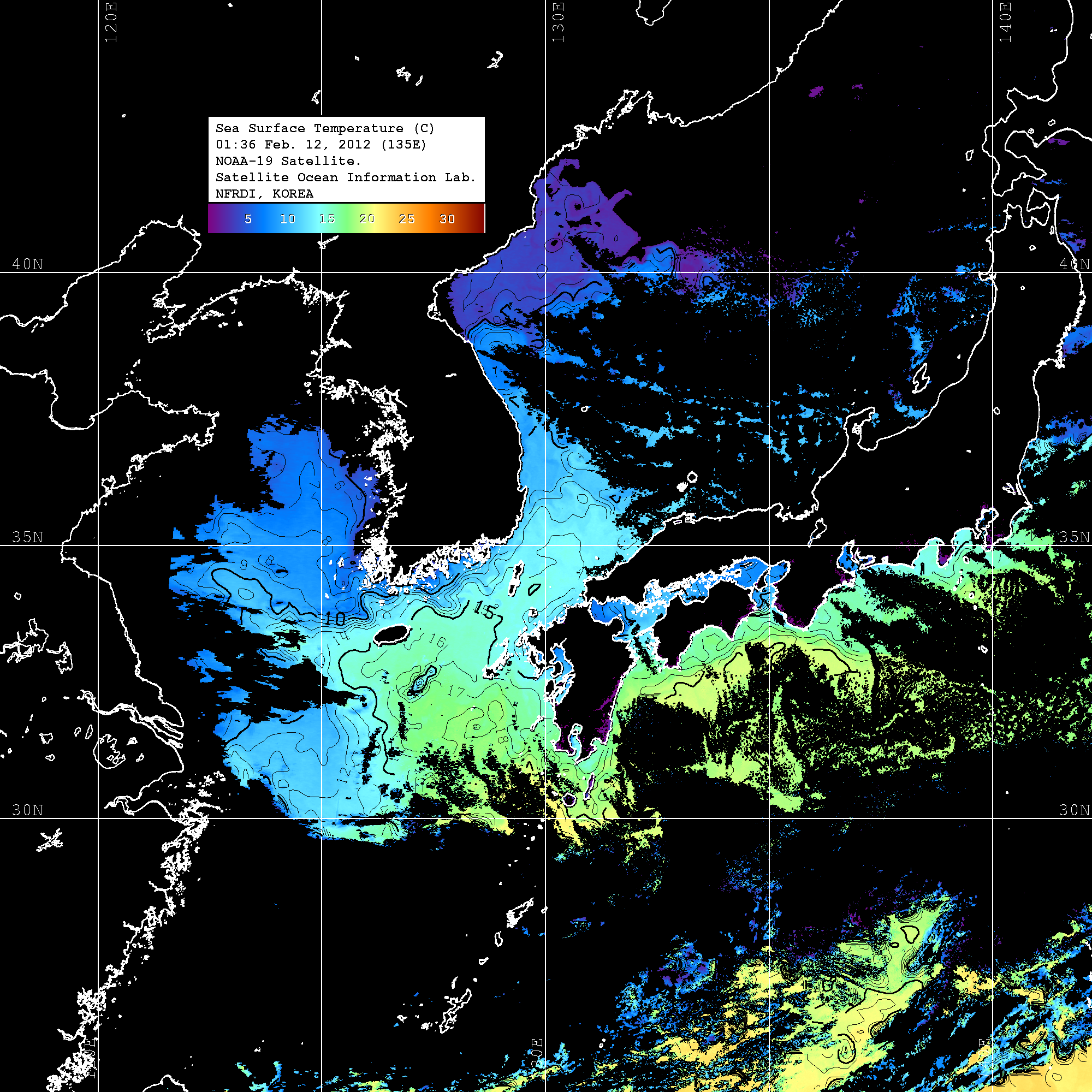 o 2012년 02월 12일 NOAA 위성영상입니다. o 영상 시간 및 수온분포는 범례를 참고하시기 바랍니다. o 검은색은 구름을 나타냅니다. o 그림을 클릭하시면 크게 보실 수 있습니다.