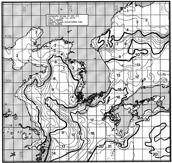 o 금주(2012.02.07~2012.02.13)의 한국근해 표면수온은 대화퇴 근해 8~10도, 울릉도 근해 10~11도, 대마도 근해 15~16도, 제주도 근해 15~16도, 이어도 근해 10~11도, 가거초 근해 8~9도, 어청도 근해 5~6도로 나타납니다. o「평년에 비해」대화퇴 근해 0.9도 높게, 울릉도 근해 0.4도 낮게, 대마도 근해 1.2도 높게, 제주도 근해 비슷하게, 이어도 근해 0.6도 높게, 가거초 근해 1.1도 낮게, 어청도 근해는 비슷하게 나타납니다. o「전년에 비해」대화퇴 근해 4도 높게, 울릉도 근해 비슷하게, 대마도 근해 2.5도 높게, 제주도 근해 1도 높게, 이어도 근해 3도 높게, 가거초 근해 비슷하게, 어청도 근해는 1도 높게 나타납니다. o 수온 전선대는 우리나라 제주해협에서 대한해협까지 14도를 중심으로 형성됩니다.