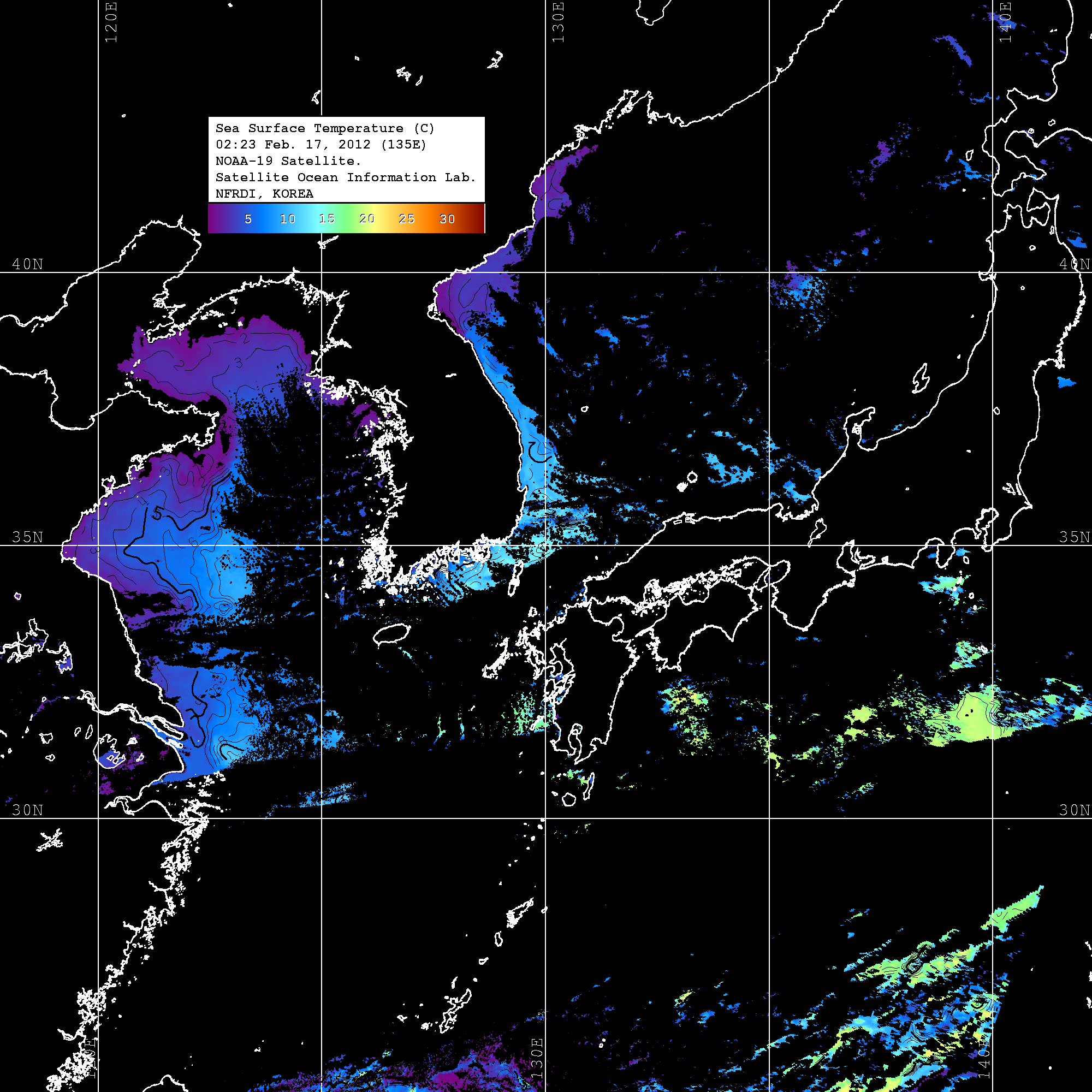 o 2012년 02월 17일 NOAA 위성영상입니다. o 영상 시간 및 수온분포는 범례를 참고하시기 바랍니다. o 검은색은 구름을 나타냅니다. o 그림을 클릭하시면 크게 보실 수 있습니다.