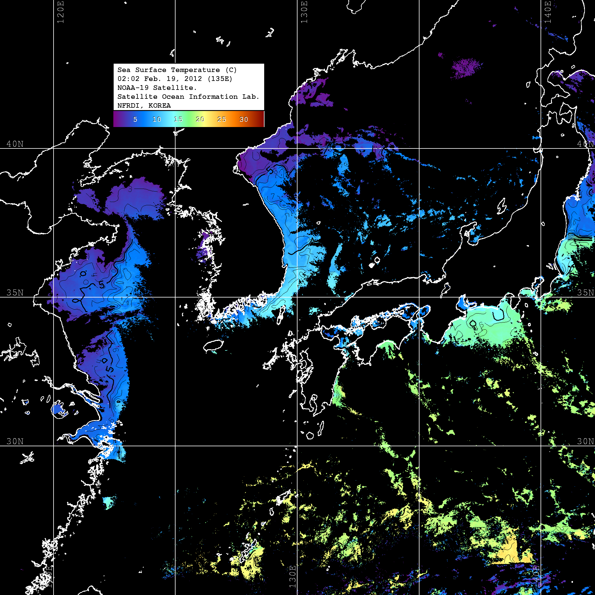 o 2012년 02월 19일 NOAA 위성영상입니다. o 영상 시간 및 수온분포는 범례를 참고하시기 바랍니다. o 검은색은 구름을 나타냅니다. o 그림을 클릭하시면 크게 보실 수 있습니다.