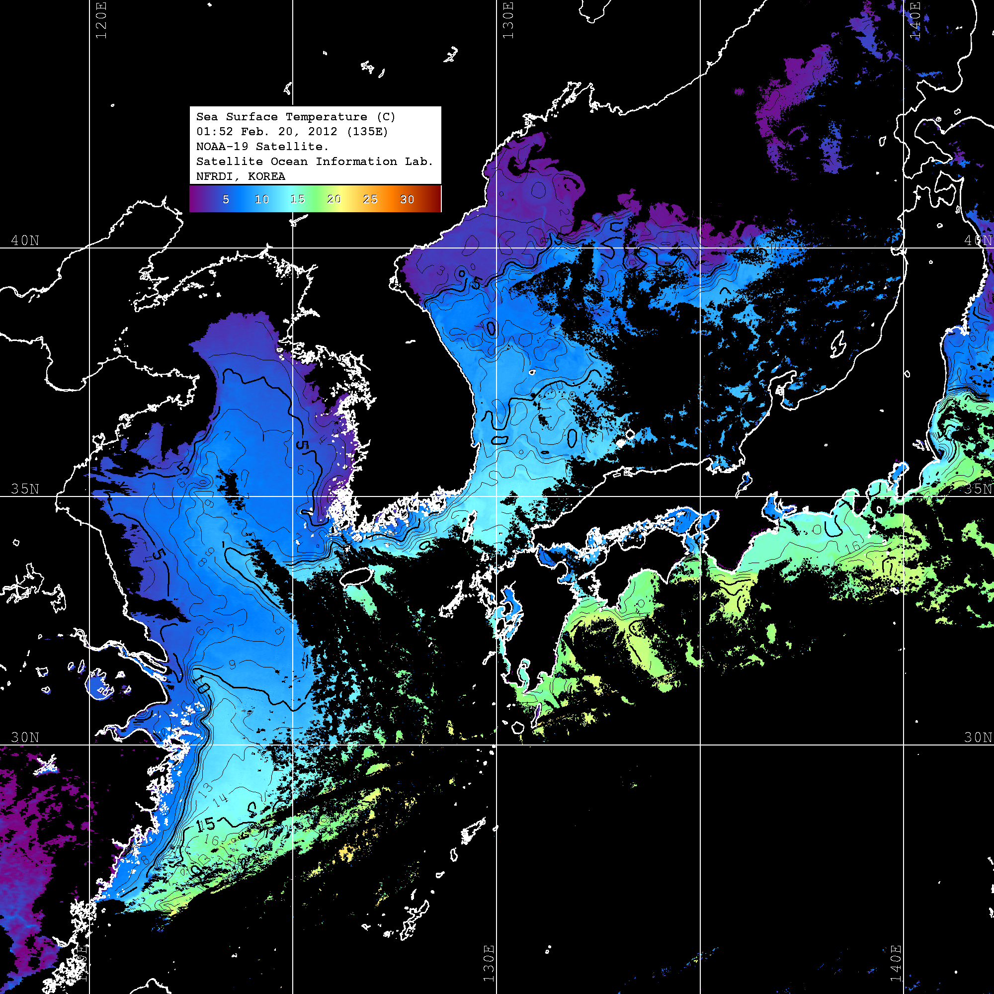 o 2012년 02월 20일 NOAA 위성영상입니다. o 영상 시간 및 수온분포는 범례를 참고하시기 바랍니다. o 검은색은 구름을 나타냅니다. o 그림을 클릭하시면 크게 보실 수 있습니다.
