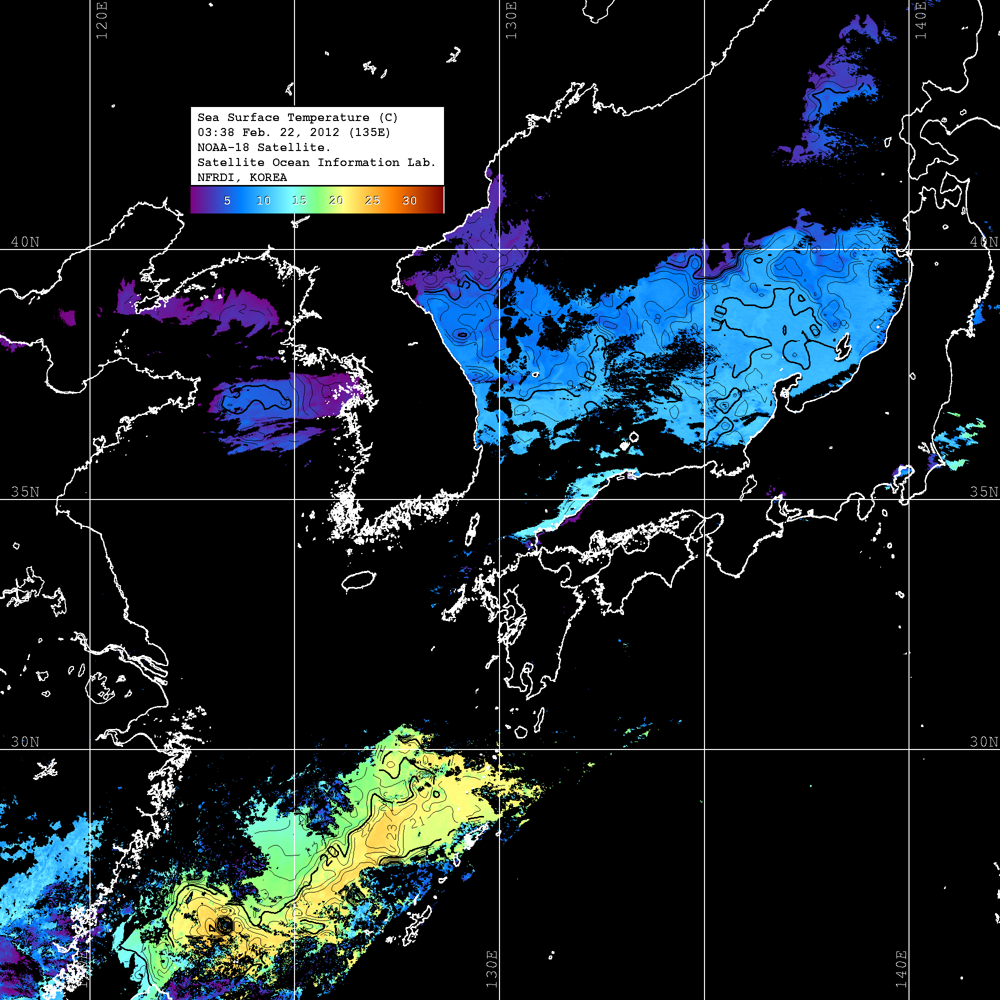 o 2012년 02월 22일 NOAA 위성영상입니다. o 영상 시간 및 수온분포는 범례를 참고하시기 바랍니다. o 검은색은 구름을 나타냅니다. o 그림을 클릭하시면 크게 보실 수 있습니다.