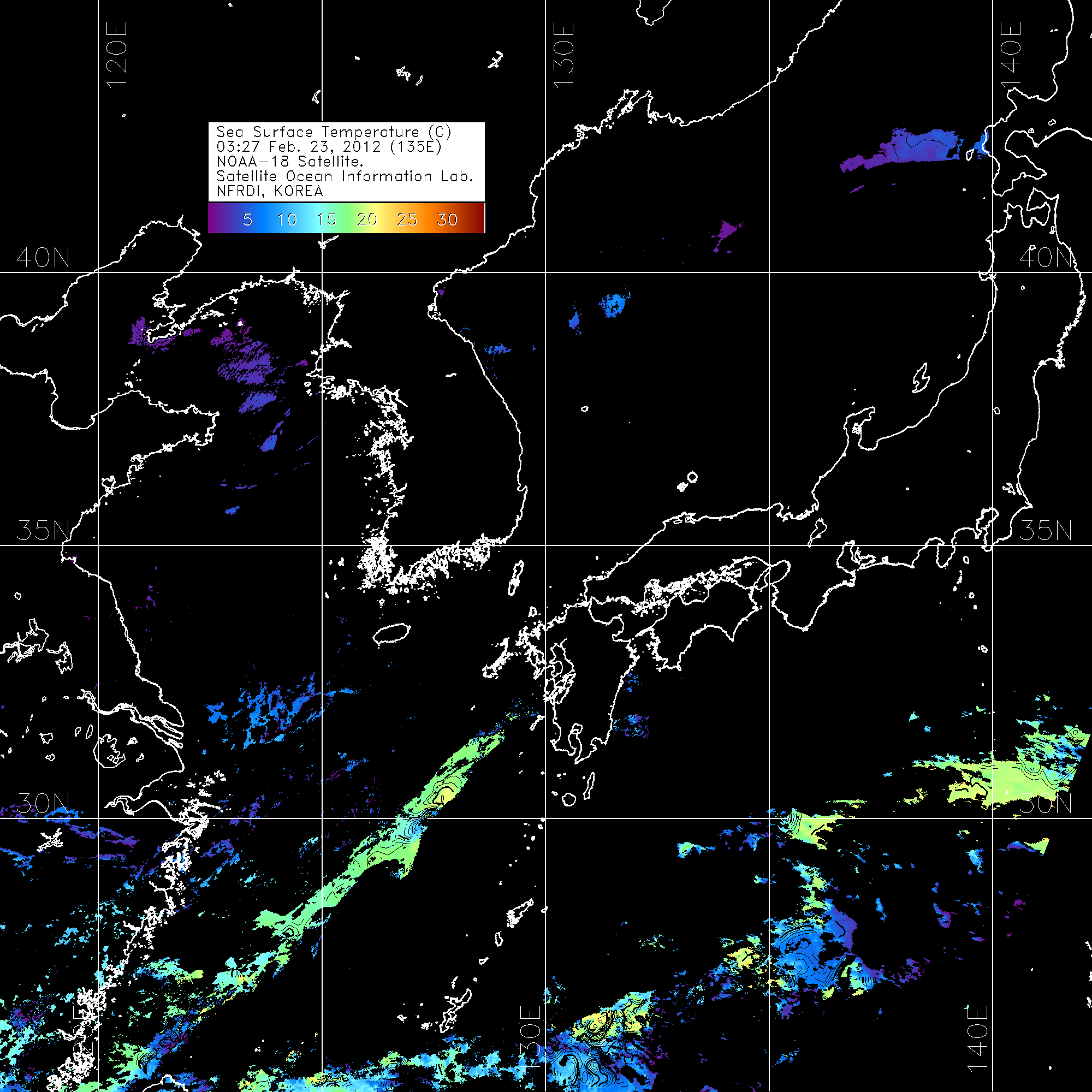 o 2012년 02월 23일 NOAA 위성영상입니다. o 영상 시간 및 수온분포는 범례를 참고하시기 바랍니다. o 검은색은 구름을 나타냅니다. o 그림을 클릭하시면 크게 보실 수 있습니다.
