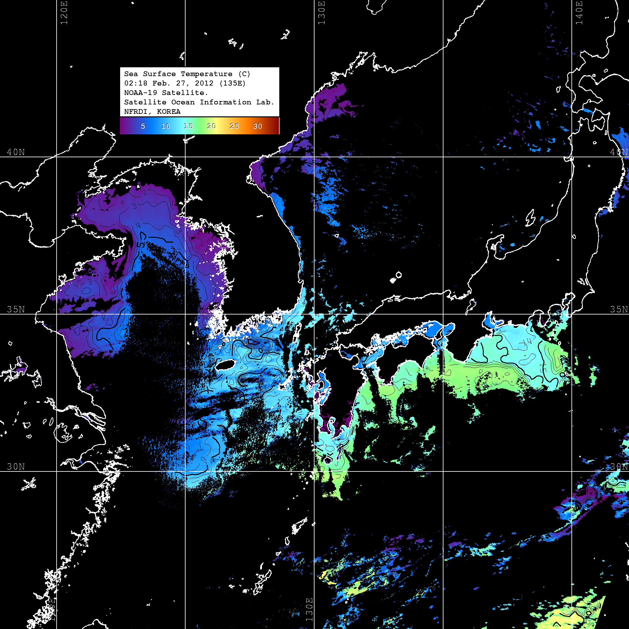 o 2012년 02월 27일 NOAA 위성영상입니다. o 영상 시간 및 수온분포는 범례를 참고하시기 바랍니다. o 검은색은 구름을 나타냅니다. o 그림을 클릭하시면 크게 보실 수 있습니다.