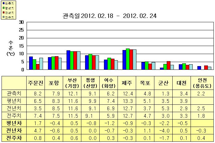 o 금주(2012.02.18~2012.02.24)의 한반도 연안 표면수온은 동해 연안역에서 섭씨 7.5~12.5도, 남해 연안역 6.0~12.5도, 서해 연안역에서 1~5도로 나타납니다. o 평년에 비해 포항 0.4도 낮음을 제외한 동해 연안역은 0.5~2.0도 높게, 남해 연안역은 0.5~1.5도 낮게, 서해 연안역은 0.5~2.5도 낮게 나타납니다. o 전년에 비해 포항 0.6도 낮음을 제외한 동해 연안역은 0.5~5.0도 높게, 통영(산양) 비슷함을 제외한 남해 연안역은 0.5~1.0도 낮게, 군산 4도 낮음을 제외한 서해 연안역은 0.5~1.0도 높게 나타납니다. o 전국 연안 양식장에서는 저수온현상이 예측되므로 피해가 발생하지 않도록 각별한 주의와 관리를 부탁드립니다.