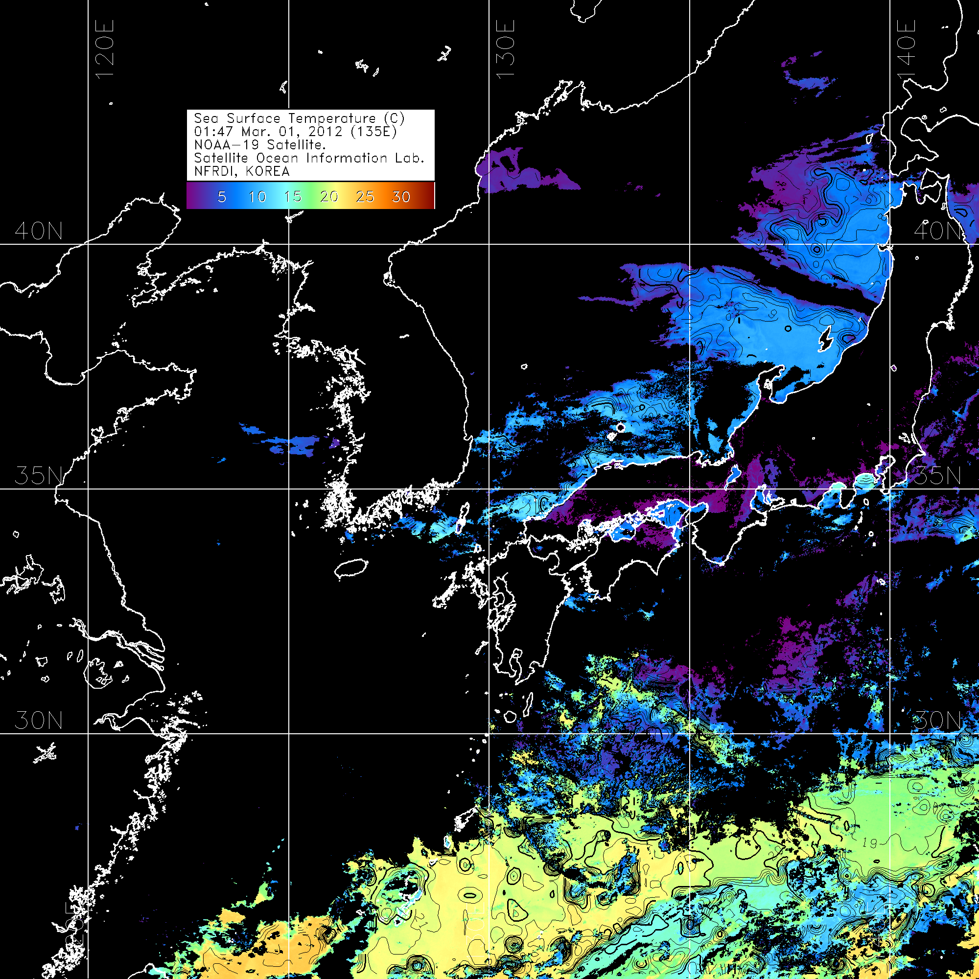 o 2012년 03월 01일 NOAA 위성영상입니다. o 영상 시간 및 수온분포는 범례를 참고하시기 바랍니다. o 검은색은 구름을 나타냅니다. o 그림을 클릭하시면 크게 보실 수 있습니다.