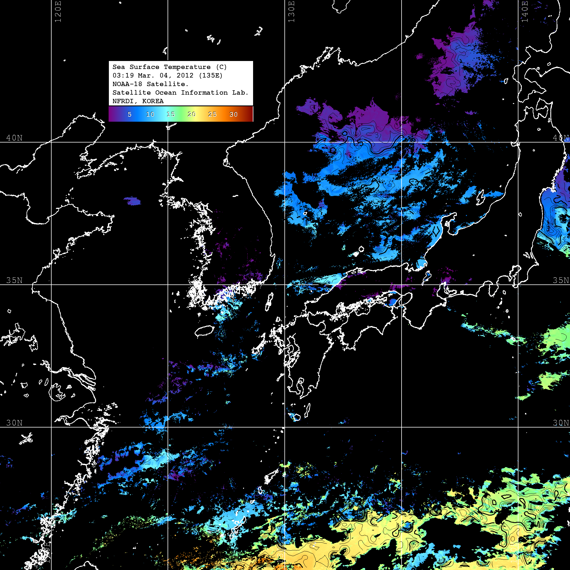 o 2012년 03월 04일 NOAA 위성영상입니다. o 영상 시간 및 수온분포는 범례를 참고하시기 바랍니다. o 검은색은 구름을 나타냅니다. o 그림을 클릭하시면 크게 보실 수 있습니다.