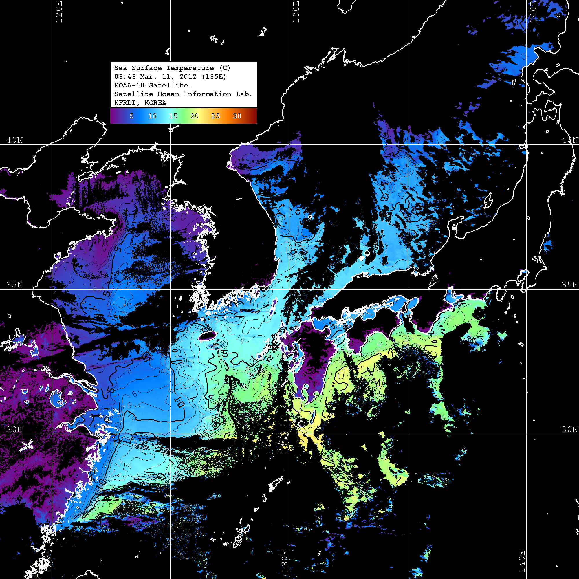 o 2012년 03월 11일 NOAA 위성영상입니다. o 영상 시간 및 수온분포는 범례를 참고하시기 바랍니다. o 검은색은 구름을 나타냅니다. o 그림을 클릭하시면 크게 보실 수 있습니다.