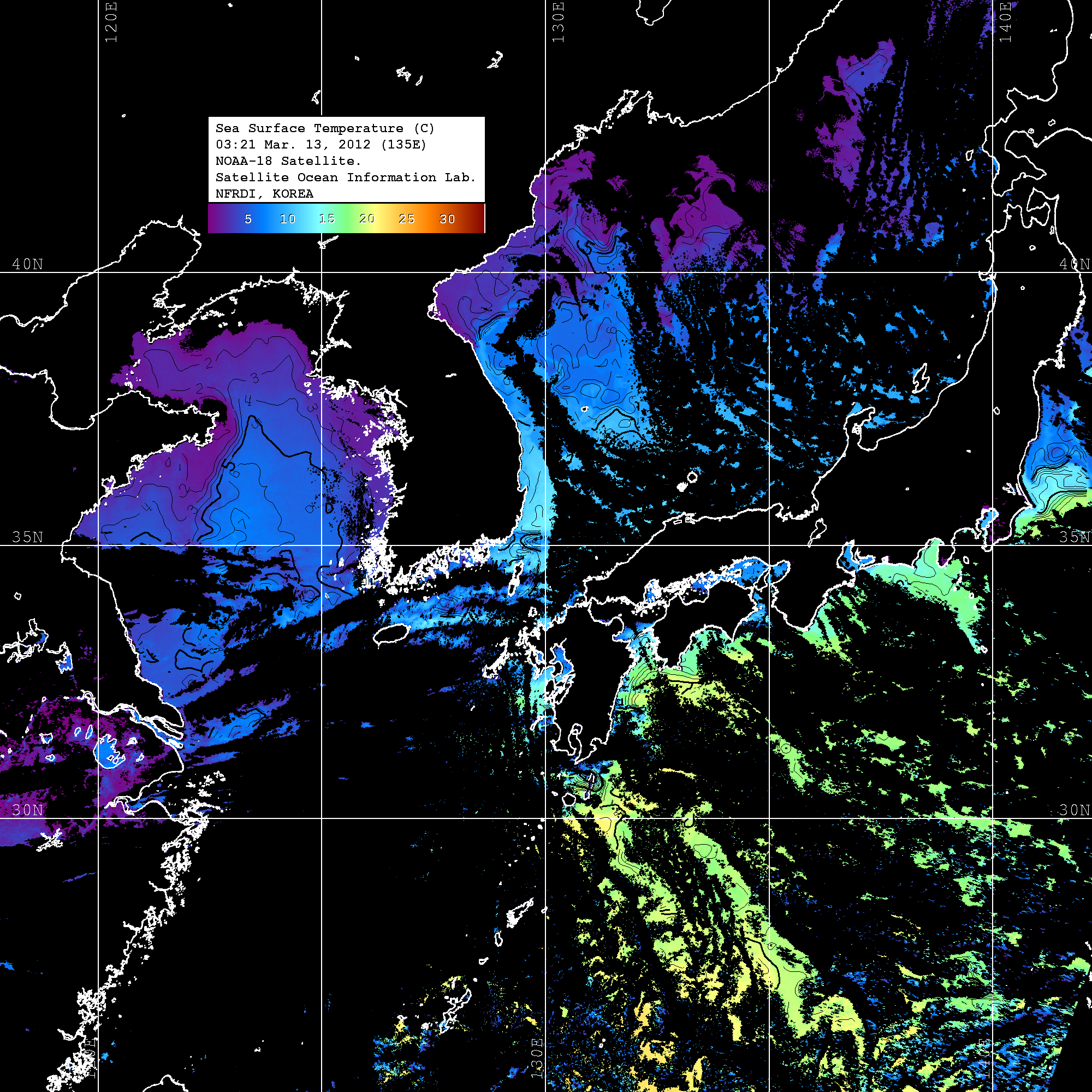 o 2012년 03월 13일 NOAA 위성영상입니다. o 영상 시간 및 수온분포는 범례를 참고하시기 바랍니다. o 검은색은 구름을 나타냅니다. o 그림을 클릭하시면 크게 보실 수 있습니다.
