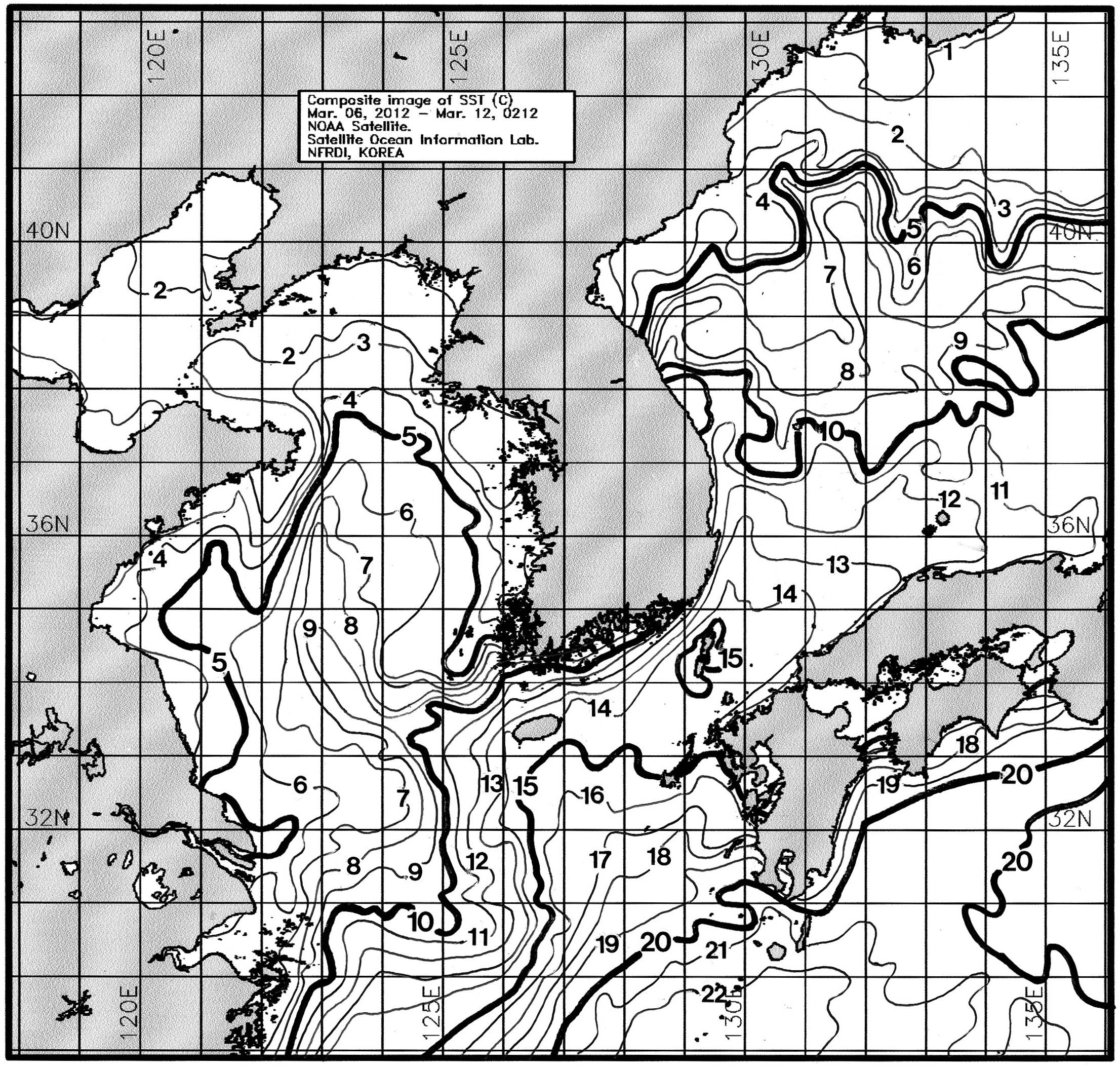 o 금주(2012.03.06~2012.03.12)의 한국근해 표면수온은 대화퇴 근해 7~9도, 울릉도 근해 9~10도, 대마도 근해 14~15도, 제주도 근해 13~14도, 이어도 근해 9~10도, 가거초 근해 6~7도, 어청도 근해 3~4도로 나타납니다. o「평년에 비해」대화퇴 근해 0.8도 높게, 울릉도 근해 비슷하게, 대마도 근해 0.6도 높게, 제주도 근해 비슷하게, 이어도 근해 0.7도 높게, 가거초 근해 2.6도 낮게, 어청도 근해는 1.3도 낮게 나타납니다. o「전년에 비해」대화퇴 근해 0.5도 높게, 울릉도 근해 0.5도 높게, 대마도 근해 1.5도 높게, 제주도 근해 0.5도 높게, 이어도 근해 2.5도 높게, 가거초 근해 3도 낮게, 어청도 근해는 비슷하게 나타납니다. o 수온 전선대는 우리나라 제주해협에서 대한해협까지 13도를 중심으로 형성됩니다.