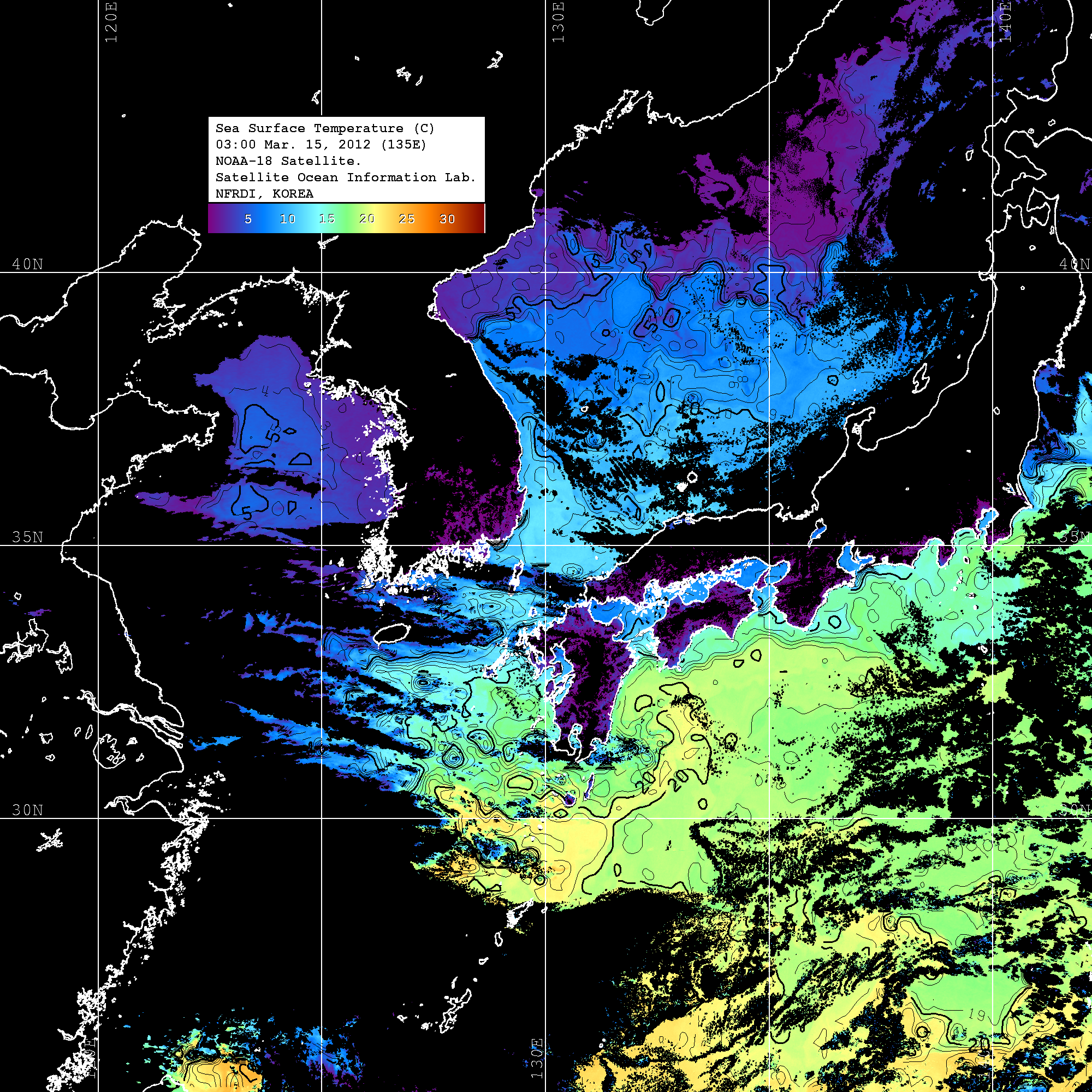 o 2012년 03월 15일 NOAA 위성영상입니다. o 영상 시간 및 수온분포는 범례를 참고하시기 바랍니다. o 검은색은 구름을 나타냅니다. o 그림을 클릭하시면 크게 보실 수 있습니다.