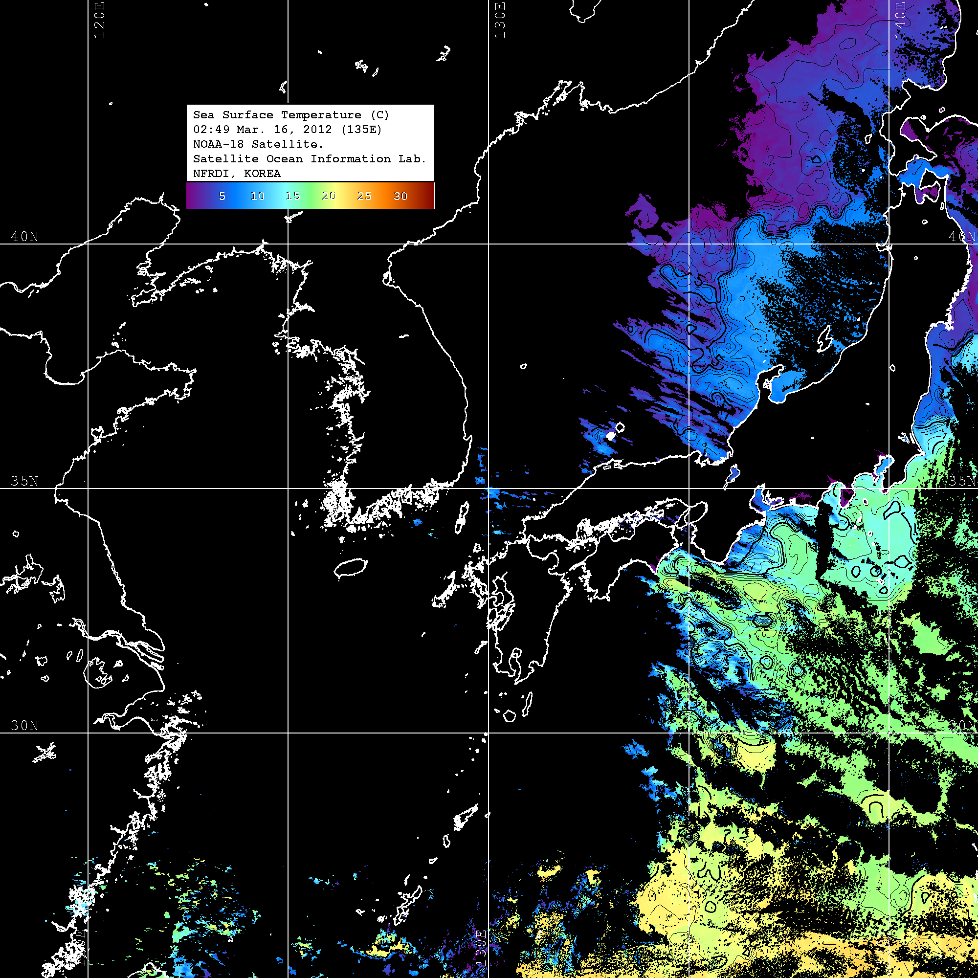 o 2012년 03월 16일 NOAA 위성영상입니다. o 영상 시간 및 수온분포는 범례를 참고하시기 바랍니다. o 검은색은 구름을 나타냅니다. o 그림을 클릭하시면 크게 보실 수 있습니다.