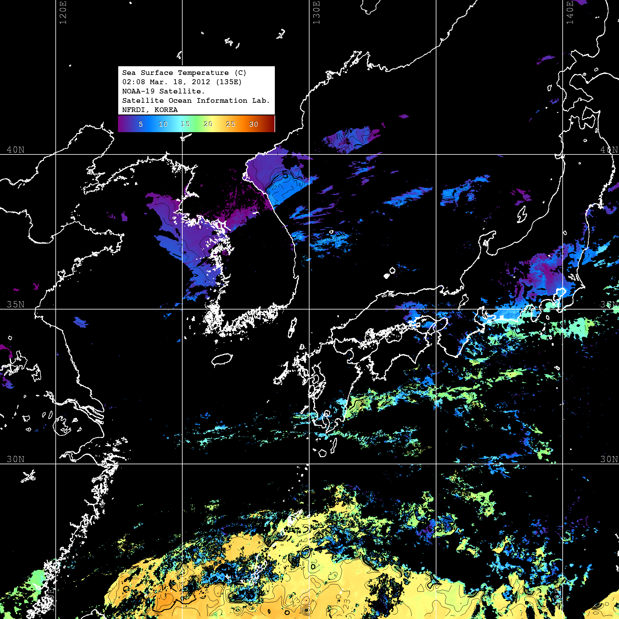 o 2012년 03월 18일 NOAA 위성영상입니다. o 영상 시간 및 수온분포는 범례를 참고하시기 바랍니다. o 검은색은 구름을 나타냅니다. o 그림을 클릭하시면 크게 보실 수 있습니다.