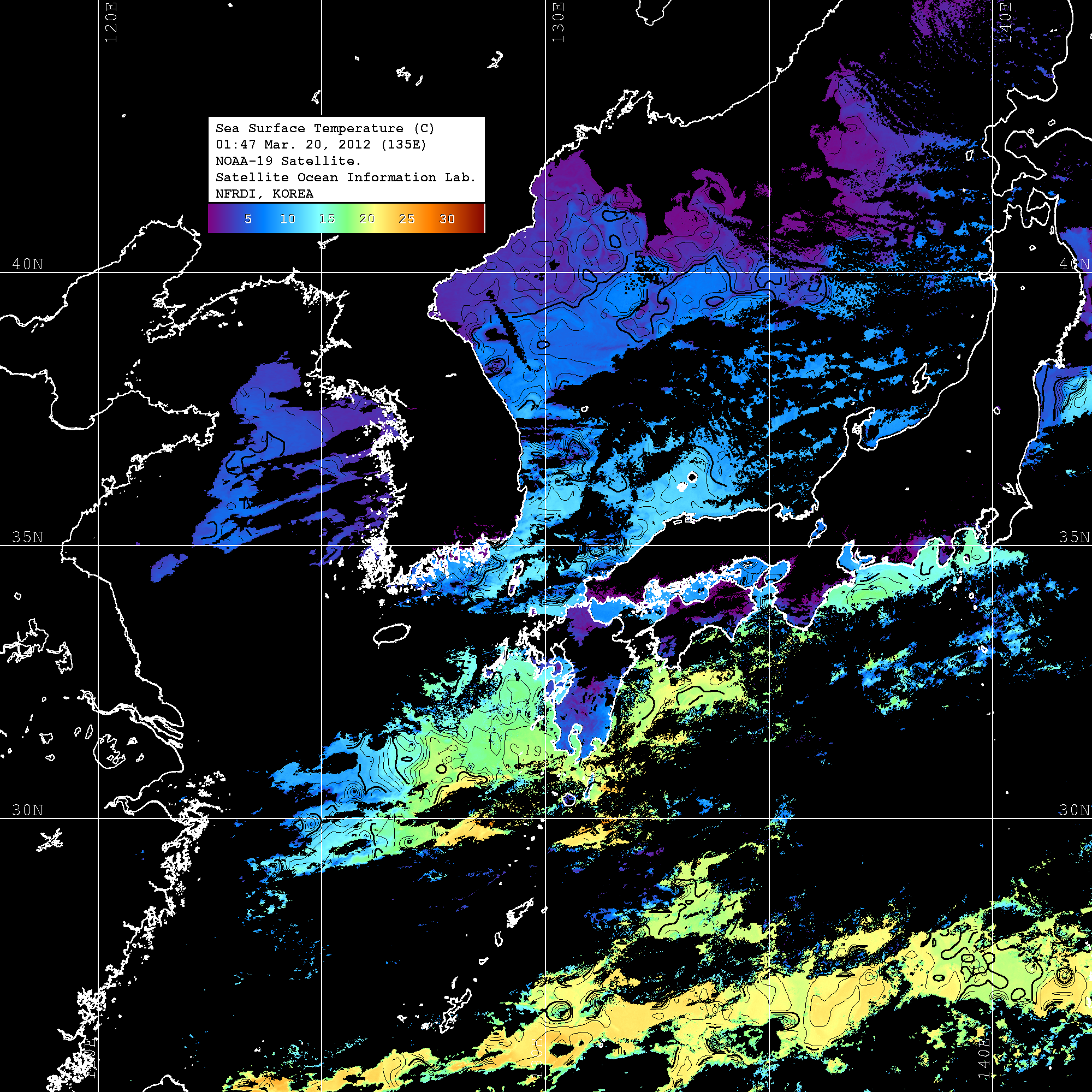 o 2012년 03월 20일 NOAA 위성영상입니다. o 영상 시간 및 수온분포는 범례를 참고하시기 바랍니다. o 검은색은 구름을 나타냅니다. o 그림을 클릭하시면 크게 보실 수 있습니다.