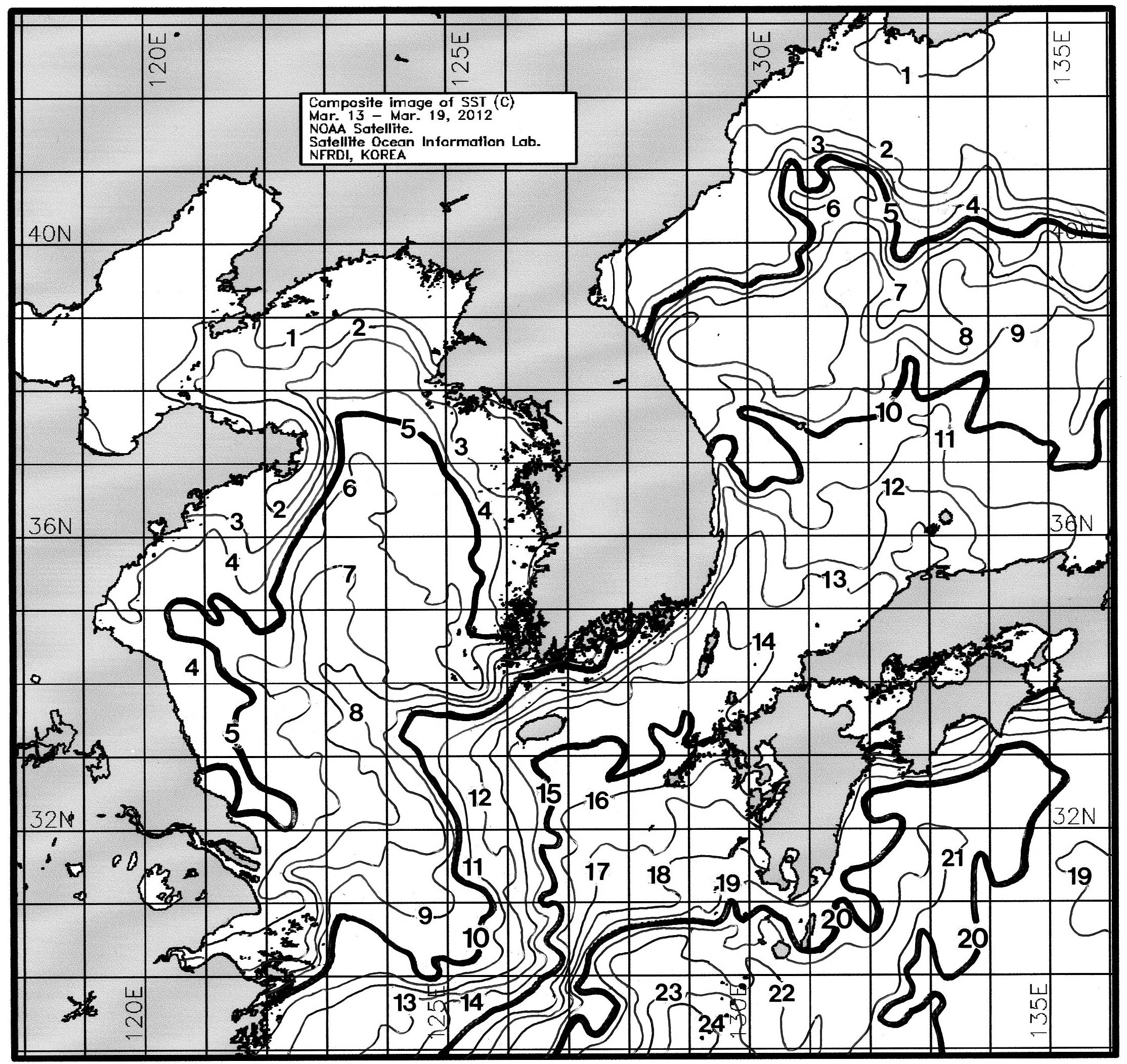 o 금주(2012.03.13~2012.03.19)의 한국근해 표면수온은 대화퇴 근해 5~6도, 울릉도 근해 9~10도, 대마도 근해 13~14도, 제주도 근해 13~15도, 이어도 근해 8~9도, 가거초 근해 6~7도, 어청도 근해 3~4도로 나타납니다. o「평년에 비해」대화퇴 근해 1.7도 낮게, 울릉도 근해 비슷하게, 대마도 근해 비슷하게, 제주도 근해 비슷하게, 이어도 근해 0.8도 낮게, 가거초 근해 2.4도 낮게, 어청도 근해는 1.6도 낮게 나타납니다. o「전년에 비해」대화퇴 근해 1도 낮게, 울릉도 근해 0.5도 높게, 대마도 근해 비슷하게, 제주도 근해 1도 높게, 이어도 근해 1도 높게, 가거초 근해 3도 낮게, 어청도 근해는 비슷하게 나타납니다. o 수온 전선대는 우리나라 제주해협에서 대한해협까지 13도를 중심으로 형성됩니다.
