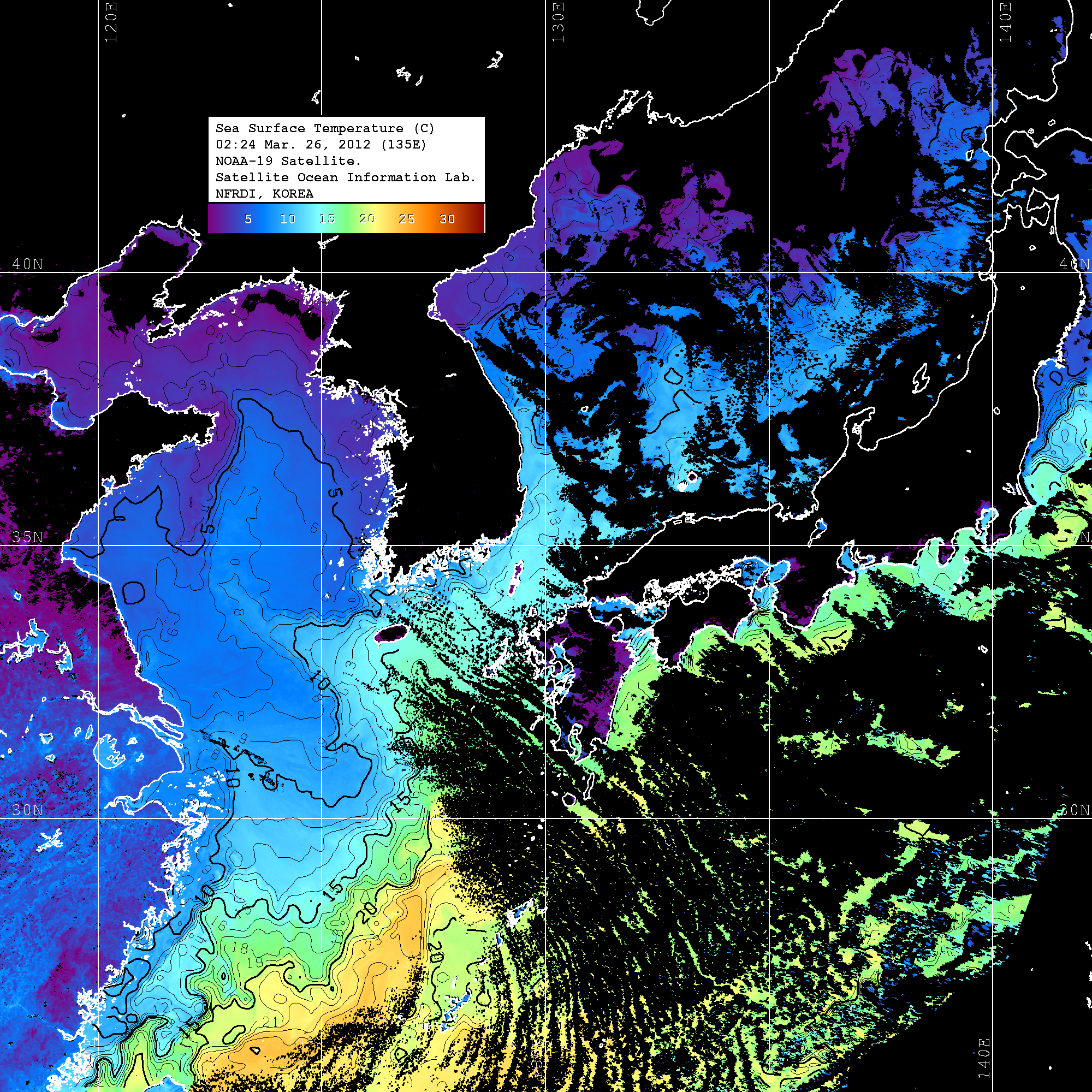 o 2012년 03월 26일 NOAA 위성영상입니다. o 영상 시간 및 수온분포는 범례를 참고하시기 바랍니다. o 검은색은 구름을 나타냅니다. o 그림을 클릭하시면 크게 보실 수 있습니다.