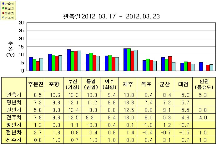 o 금주(2012.03.17~2012.03.23)의 한반도 연안 표면수온은 동해 연안역에서 섭씨 8.5~13.5도, 남해 연안역 9~14도, 서해 연안역에서 5.0~8.5도로 나타납니다. o 평년에 비해 동해 연안역은 0.5~1.5도 높게, 제주 비슷함을 제외한 남해 연안역은 0.5~1.0도 낮게, 군산 1.2도 높음을 제외한 서해 연안역은 0.5~1.0도 낮게 나타납니다. o 전년에 비해 동해 연안역은 0.5~3.0도 높게, 남해 연안역은 0.5~1.5도 높게, 인천(용유도) 1.5도 높음을 제외한 서해 연안역은 0.5~1.0도 낮게 나타납니다.