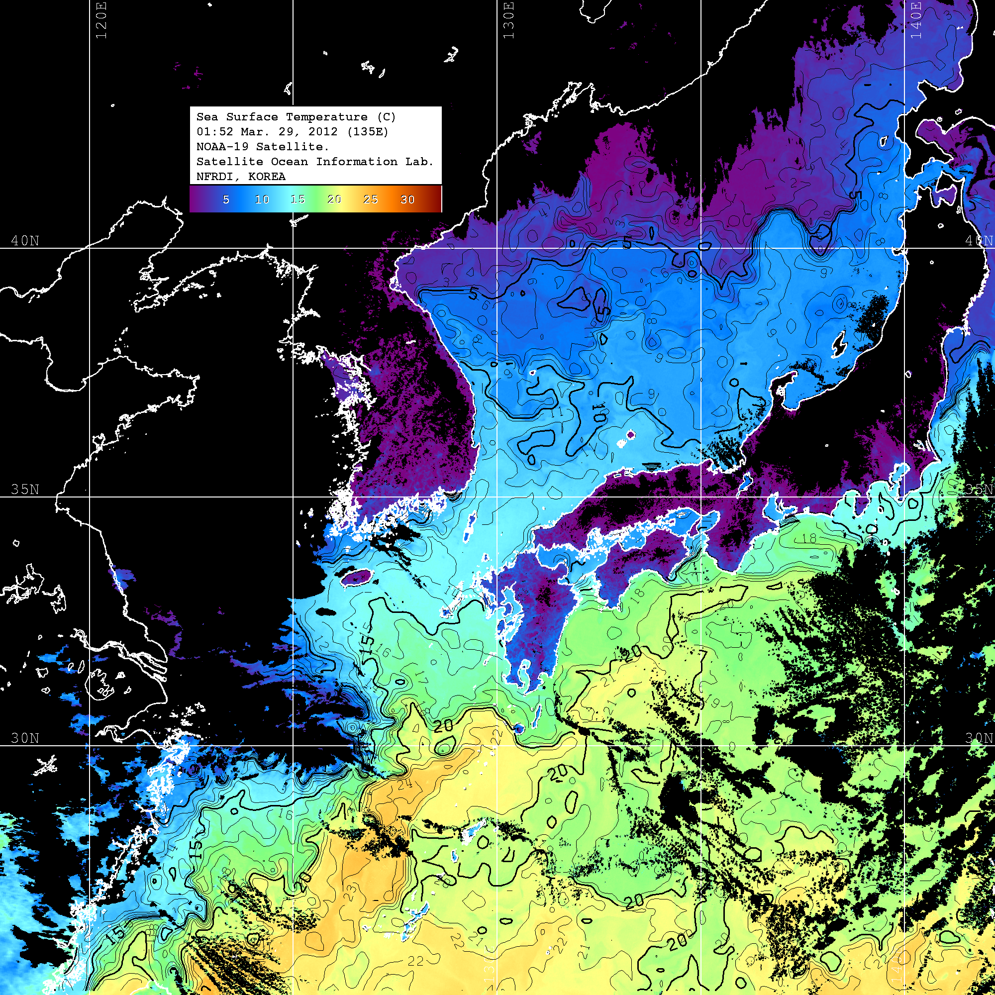 o 2012년 03월 29일 NOAA 위성영상입니다. o 영상 시간 및 수온분포는 범례를 참고하시기 바랍니다. o 검은색은 구름을 나타냅니다. o 그림을 클릭하시면 크게 보실 수 있습니다.
