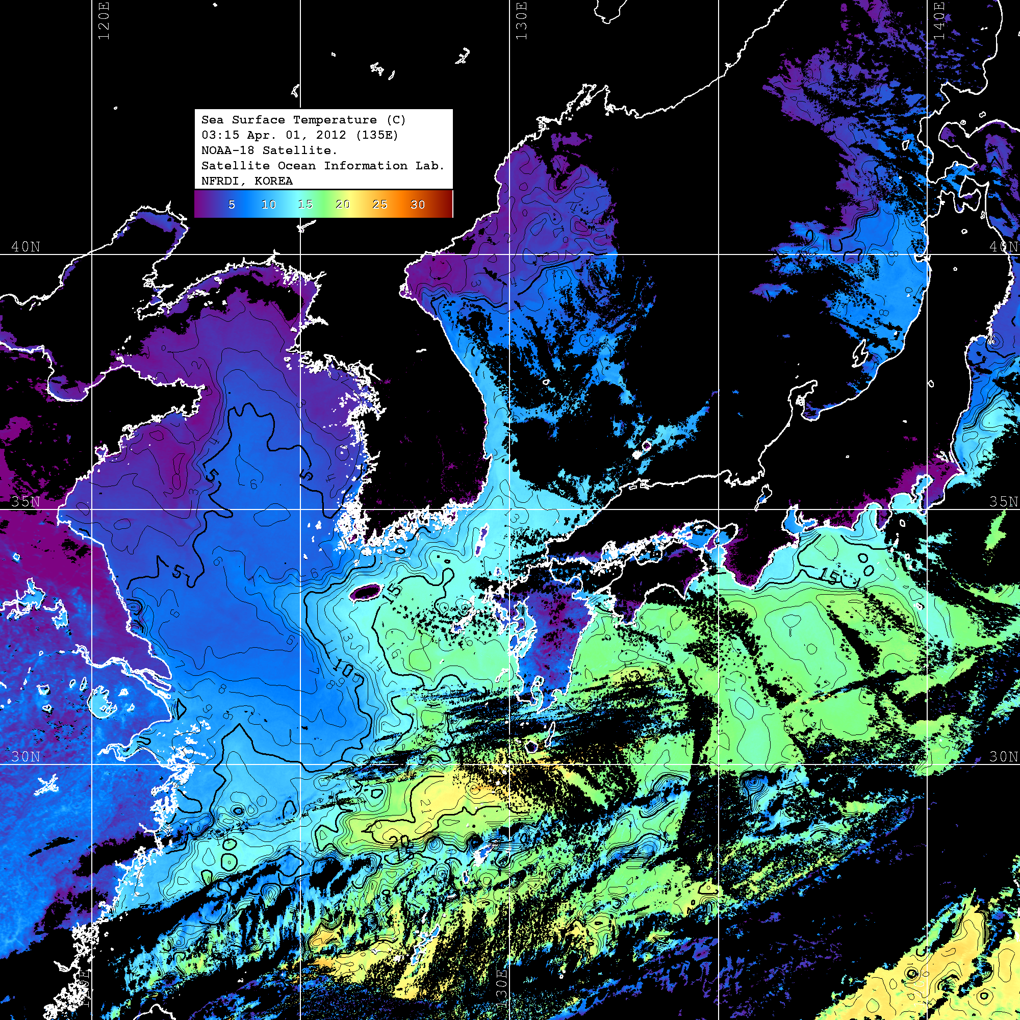 o 2012년 04월 01일 NOAA 위성영상입니다. o 영상 시간 및 수온분포는 범례를 참고하시기 바랍니다. o 검은색은 구름을 나타냅니다. o 그림을 클릭하시면 크게 보실 수 있습니다.