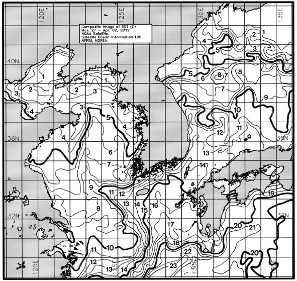 o 금주(2012.03.27~2012.04.02)의 한국근해 표면수온은 대화퇴 근해 5~7도, 울릉도 근해 9~11도, 대마도 근해 14~15도, 제주도 근해 14~15도, 이어도 근해 8~9도, 가거초 근해 7~8도, 어청도 근해 4~5도로 나타납니다. o「평년에 비해」대화퇴 근해 1.7도 낮게, 울릉도 근해 비슷하게, 대마도 근해 비슷하게, 제주도 근해 비슷하게, 이어도 근해 1도 낮게, 가거초 근해 1.6도 낮게, 어청도 근해는 1.6도 낮게 나타납니다. o「전년에 비해」대화퇴 근해 2.5도 낮게, 울릉도 근해 비슷하게, 대마도 근해 0.5도 높게, 제주도 근해 비슷하게, 이어도 근해 비슷하게, 가거초 근해 2.5도 낮게, 어청도 근해는 0.5도 낮게 나타납니다. o 수온 전선대는 우리나라 제주해협에서 대한해협까지 13도를 중심으로 형성됩니다.