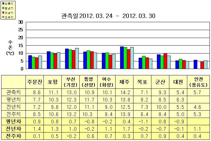 o 금주(2012.03.24~2012.03.30)의 한반도 연안 표면수온은 동해 연안역에서 섭씨 8.5~13.0도, 남해 연안역 10.0~14.5도, 서해 연안역에서 5.0~9.5도로 나타납니다. o 평년에 비해 동해 연안역은 0.5~1.0도 높게, 제주 0.4도 높음을 제외한 남해 연안역은 0.5~1.0도 낮게, 군산 0.8도 높음을 제외한 서해 연안역은 0.5~1.5도 낮게 나타납니다. o 전년에 비해 동해 연안역은 1.0~1.5도 높게, 통영(산양) 비슷함을 제외한 남해 연안역은 1~2도 높게, 인천(용유도) 1.1도 높음을 제외한 서해 연안역은 0.5~1.0도 낮게 나타납니다.