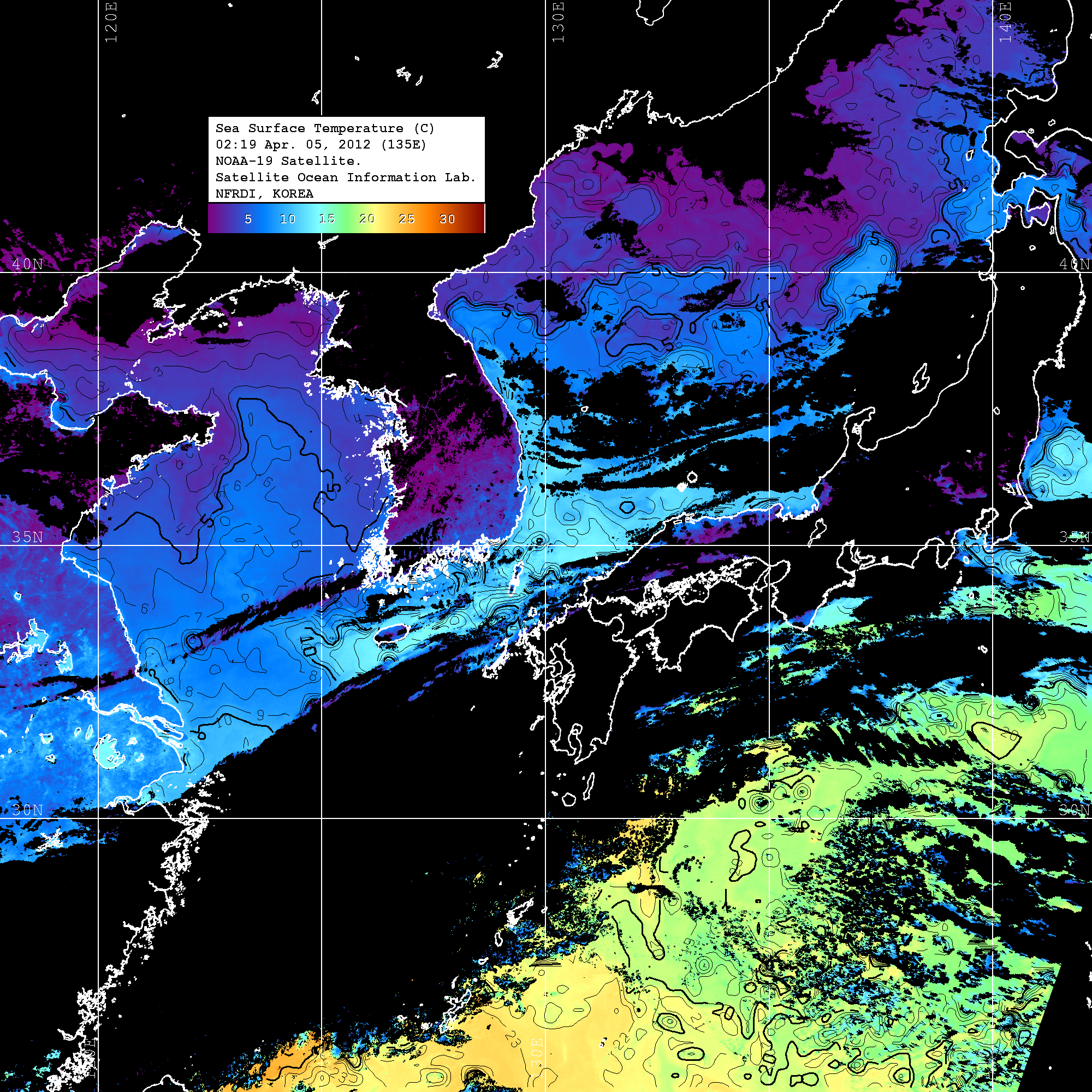 o 2012년 04월 05일 NOAA 위성영상입니다. o 영상 시간 및 수온분포는 범례를 참고하시기 바랍니다. o 검은색은 구름을 나타냅니다. o 그림을 클릭하시면 크게 보실 수 있습니다.