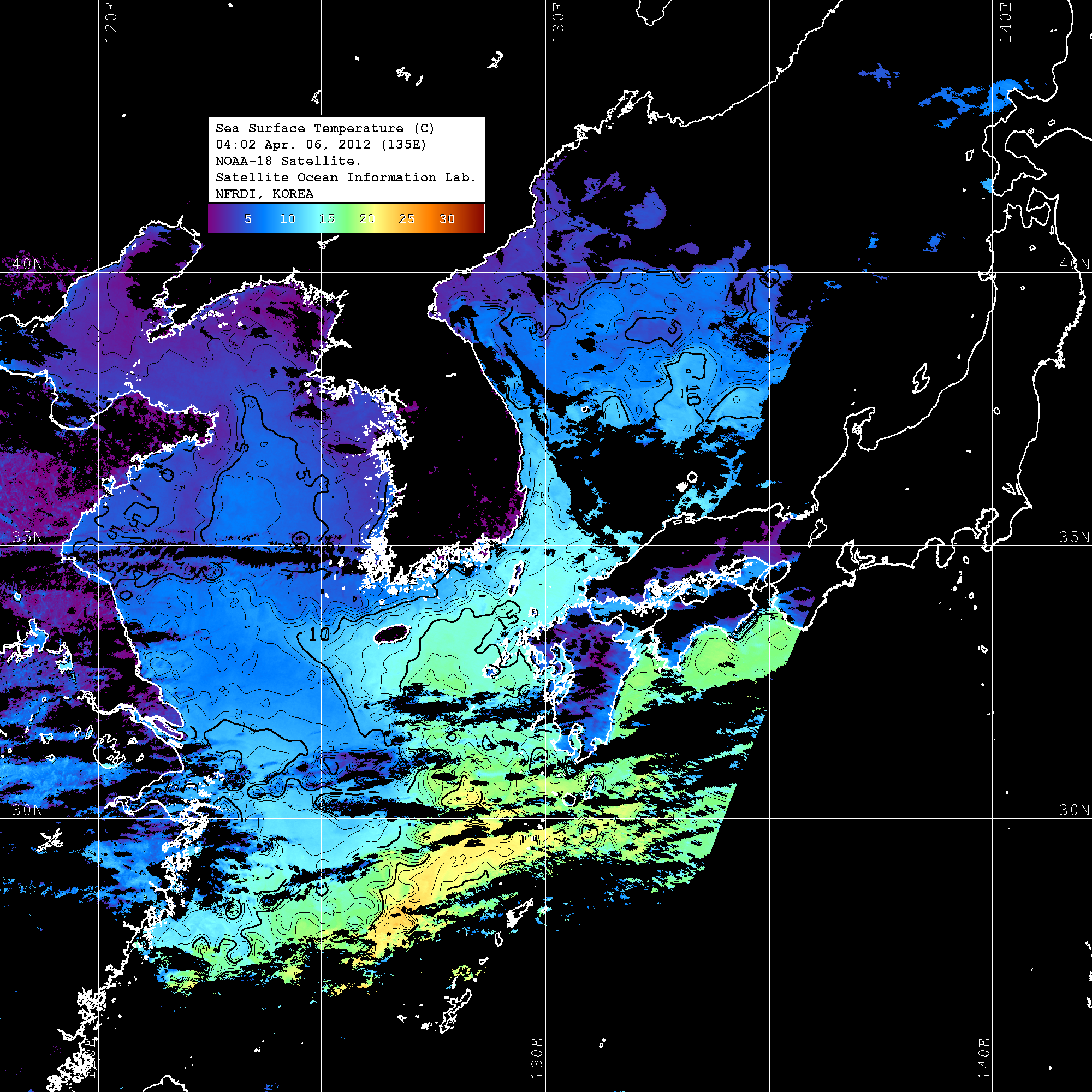 o 2012년 04월 06일 NOAA 위성영상입니다. o 영상 시간 및 수온분포는 범례를 참고하시기 바랍니다. o 검은색은 구름을 나타냅니다. o 그림을 클릭하시면 크게 보실 수 있습니다.