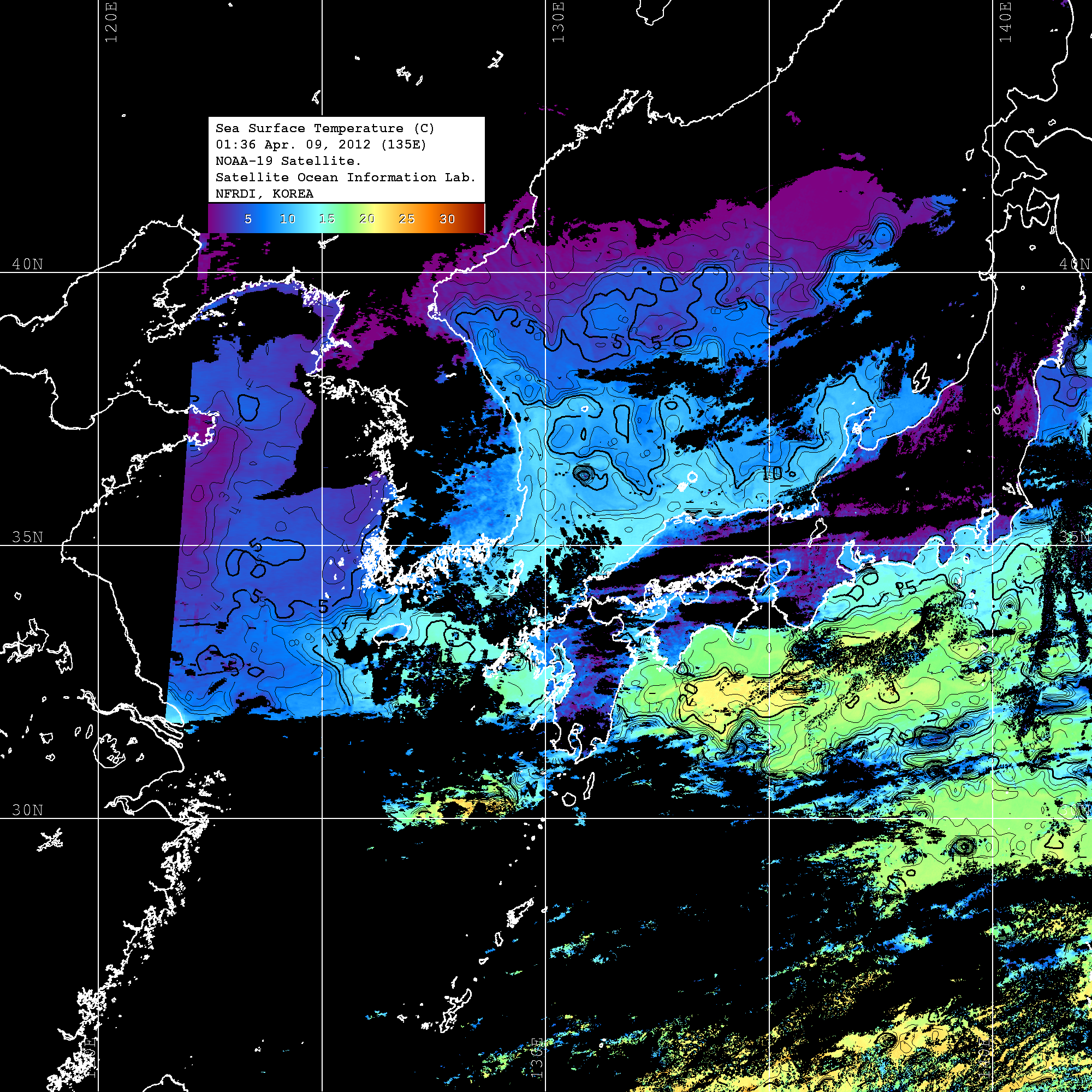 o 2012년 04월 09일 NOAA 위성영상입니다. o 영상 시간 및 수온분포는 범례를 참고하시기 바랍니다. o 검은색은 구름을 나타냅니다. o 그림을 클릭하시면 크게 보실 수 있습니다.