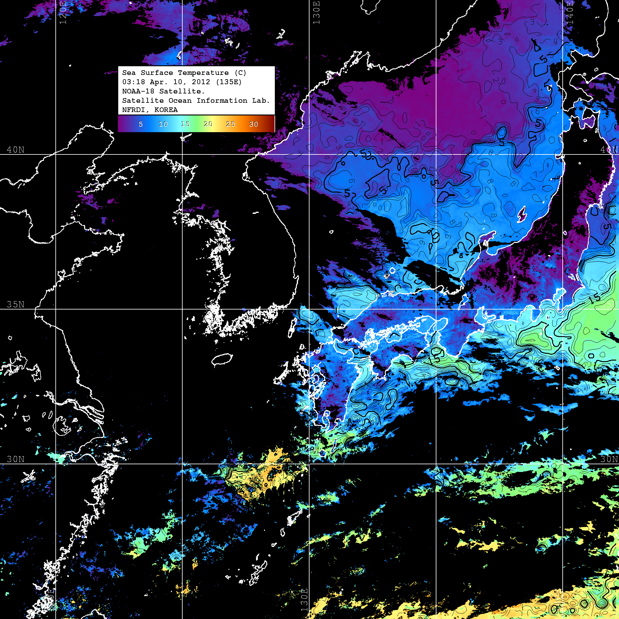 o 2012년 04월 10일 NOAA 위성영상입니다. o 영상 시간 및 수온분포는 범례를 참고하시기 바랍니다. o 검은색은 구름을 나타냅니다. o 그림을 클릭하시면 크게 보실 수 있습니다.